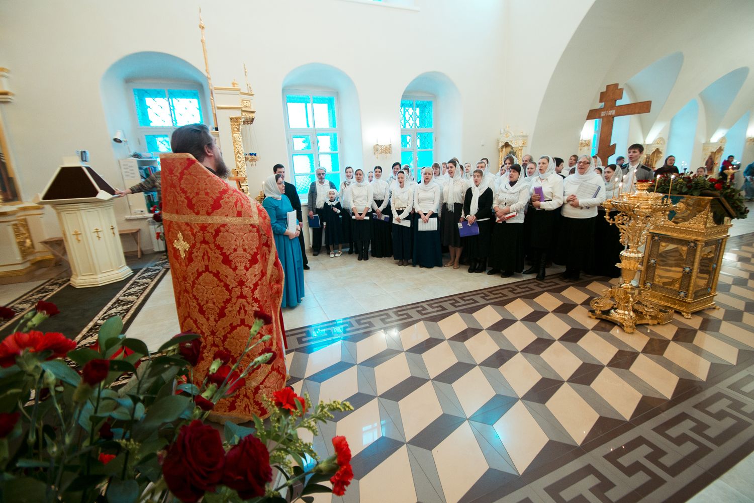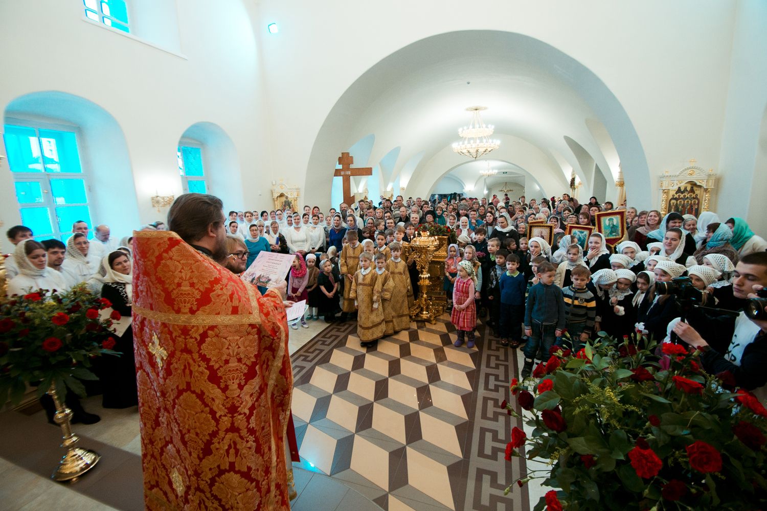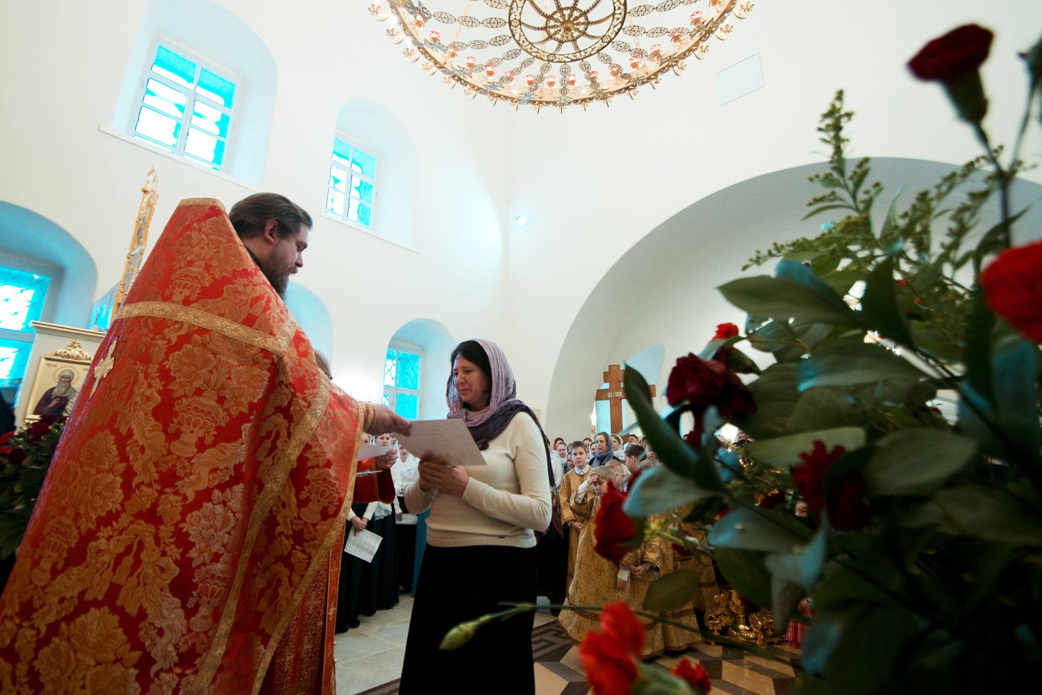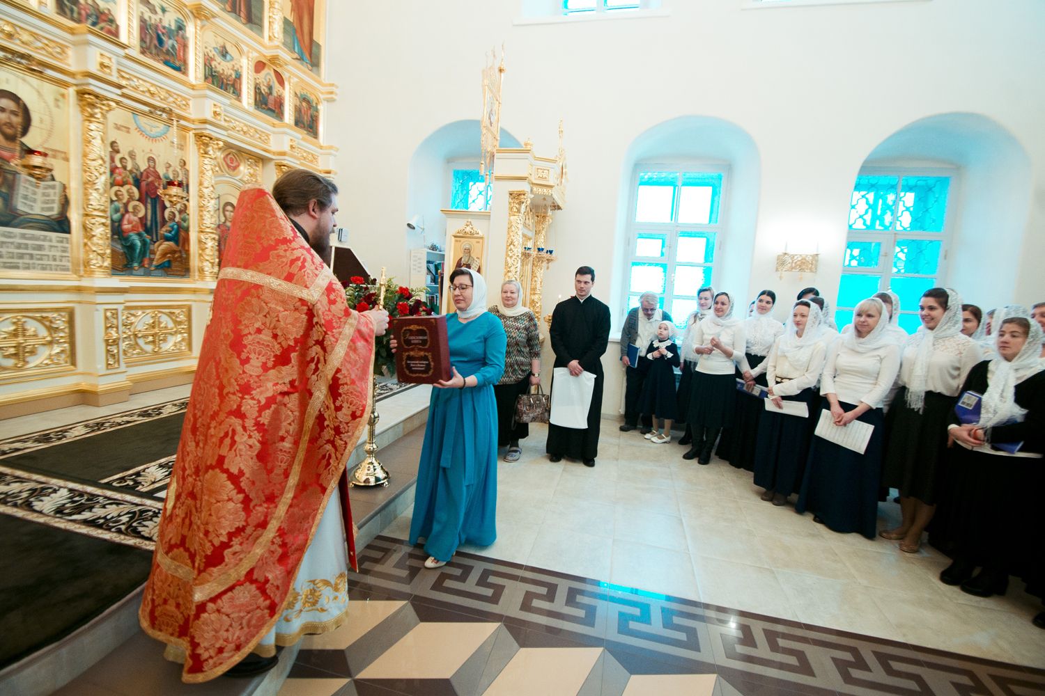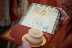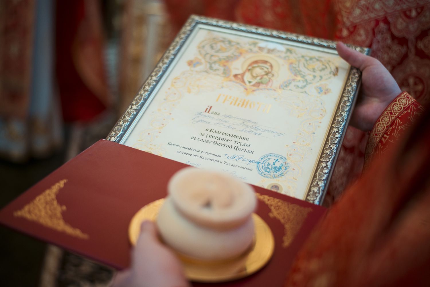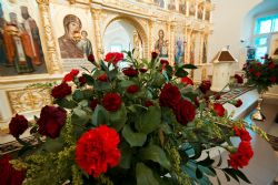 От имени митрополита Казанского и Татарстанского Феофана благочинный преподнес юбиляру архиерейскую грамоту за усердные труды во славу Святой Церкви и поздравительный адрес, а затем вручил слушателям приходских курсов церковной флористики сертификаты об их окончании.
