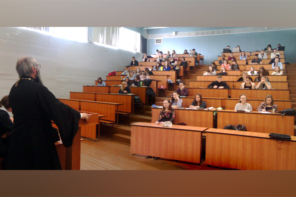 Священник рассказал аудитории об истории подворья, являвшегося в прошлом монастырем и ведущим свое начало с середины 17-го века. В ходе лекции были затронуты и культурологические аспекты христианского вероисповедания.
