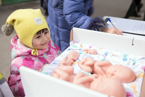 После флешмоба дети с большим интересом изучали муляжи эмбрионов, изготовленные из специального материала, на ощупь напоминающего кожу младенца.