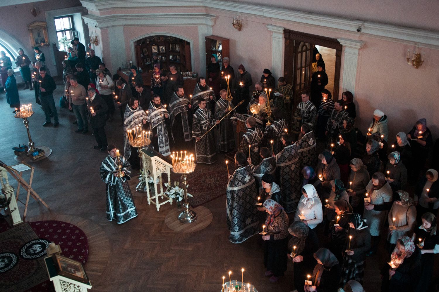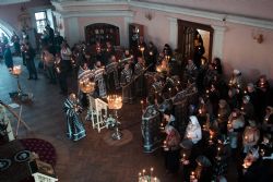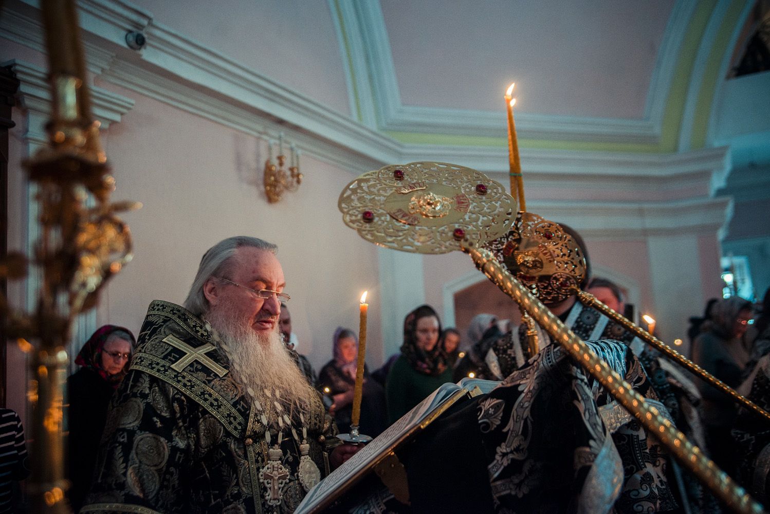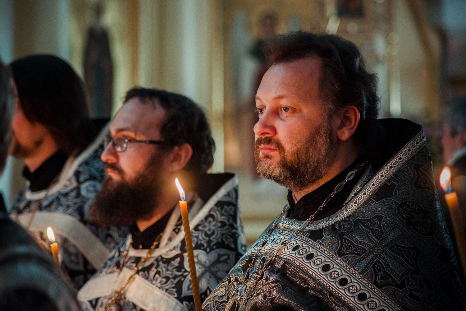 Песнопения вечернего богослужения исполнил архиерейский мужской хор под управлением Дениса Рогова.