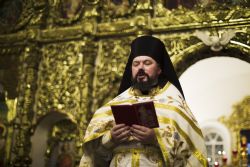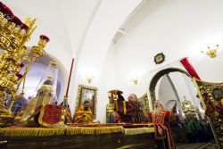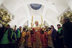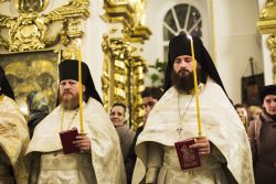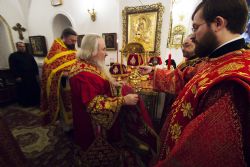 За богослужением владыке священноархимандриту сослужила братия монастыря в священном сане во главе с исполняющим обязанности наместника иеромонахом Илией (Казанцевым). Песнопения исполнил архиерейский мужской хор под управлением Дениса Рогова.
