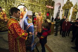 Преподавая архипастырское благословение, владыка митрополит раздал участникам богослужения декоративные пасхальные яйца, а самым молодым из них — сладкие подарки.