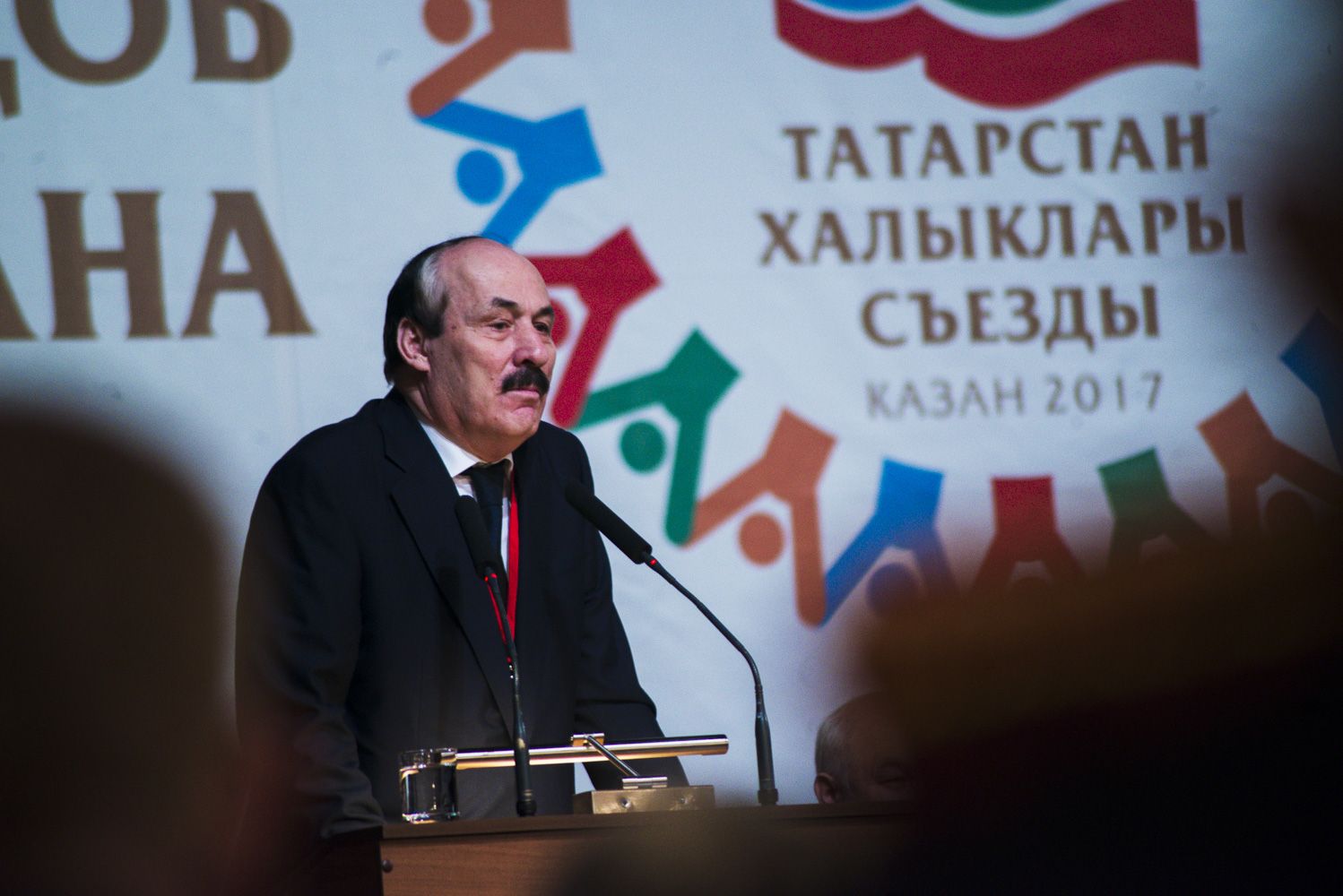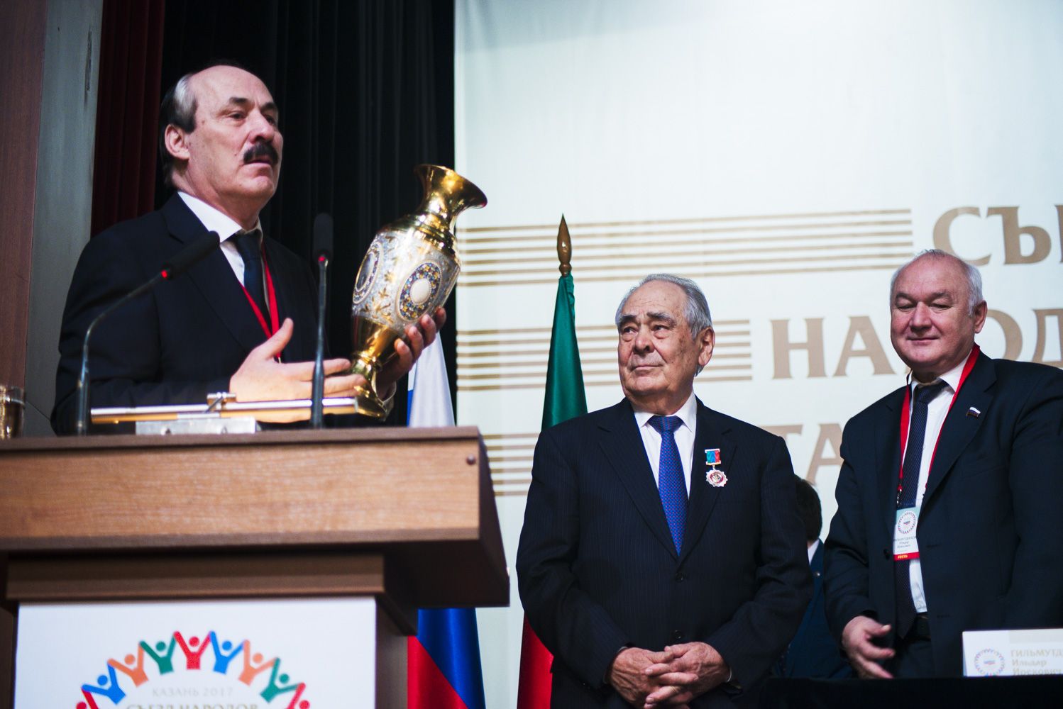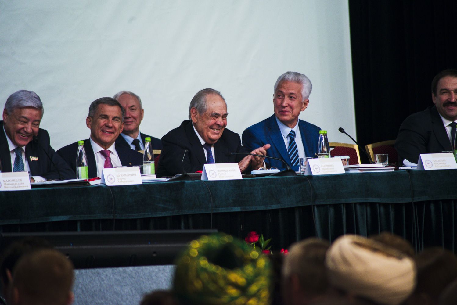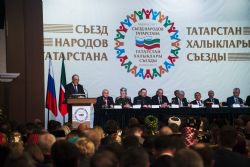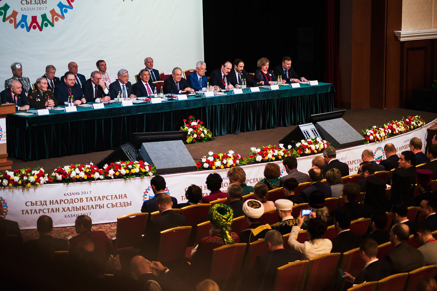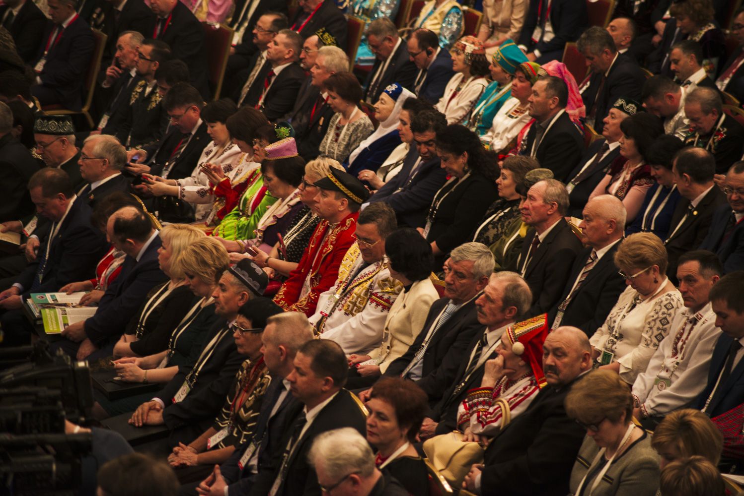 В президиуме съезда — Президент Республики Татарстан Р.Н. Минниханов, Государственный советник РТ М.Ш. Шаймиев, заместитель руководителя администрации Президента Российской Федерации М.М. Магомедов, заместитель Председателя Государственной Думы Федерального Собрания Российской Федерации В.А. Васильев, глава Республики Дагестан Р.Г. Абдулатипов, руководитель оргкомитета Съезда народов Татарстана, председатель Государственного Совета Ф.Х. Мухаметшин и другие официальные лица.