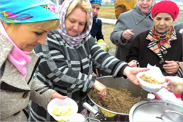 В завершение праздника во дворе храма была развернута военно-полевая кухня. Сестры из трапезной угощали пришедших в этот день в храм гречневой и пшенной кашами с тушенкой, компотом и свежевыпеченными плюшками.