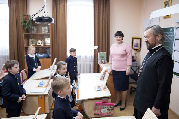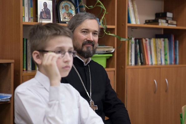 Затем делегация в сопровождении исполнительного директора и заместителя директора по учебной работе посетили уроки всех четырех классов гимназии, побеседовали с воспитанниками и преподавателями. Отец Андрей рассказывал детям познавательные стихотворения, автором которых он сам является.