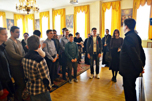Далее мероприятие продолжил студент IV курса Михаил Максимов, который провел для гостей экскурсию: молодые люди посетили библиотеку, обновленный компьютерный кабинет; осмотрели храм в честь святого праведного Иоанна Кронштадтского, учебные аудитории и кельи учащихся, побывали в спортивном зале.