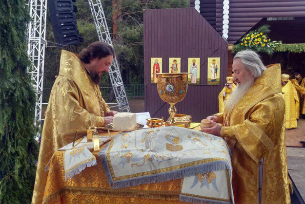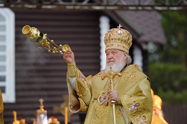 Предстоятель Русской Православной Церкви прибыл в село Великорецкое Юрьянского района Кировской области. На берегу реки Великой Святейший Патриарх Кирилл совершил Божественную литургию. На аналое за престолом, установленным под сенью, находился чтимый список Великорецкой чудотворной иконы святого Николая Чудотворца.