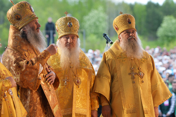Для удобства многочисленных верующих богослужение транслировалось на больших экранах, установленных на берегу реки Великой и на территории Великорецкой обители.