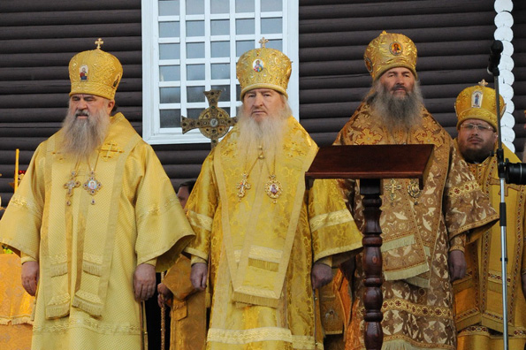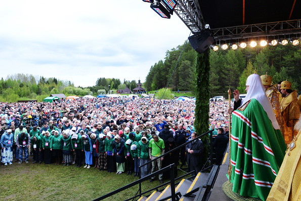 По окончании Литургии митрополит Вятский Марк приветствовал Святейшего Владыку. По словам главы Вятской митрополии, впервые за более чем шестивековую историю Великорецкого крестного хода в нем принимает участие Предстоятель Русской Церкви. От себя и от временно исполняющего обязанности губернатора Кировской области И.В. Васильева митрополит Марк преподнес Его Святейшеству икону святителя Николая Чудотворца.