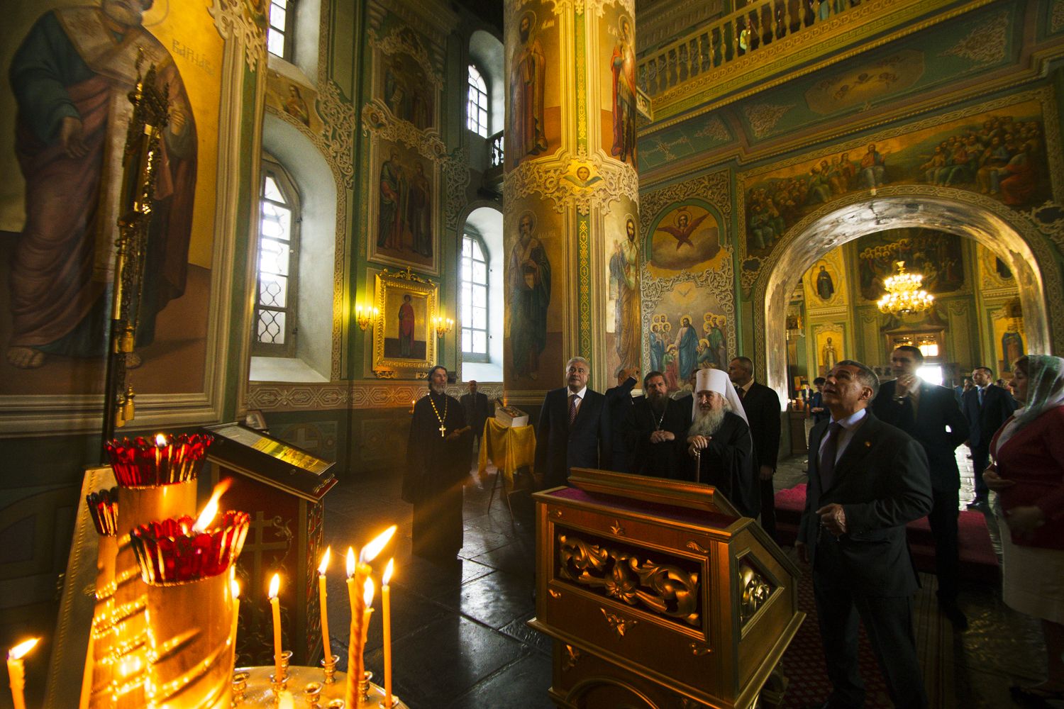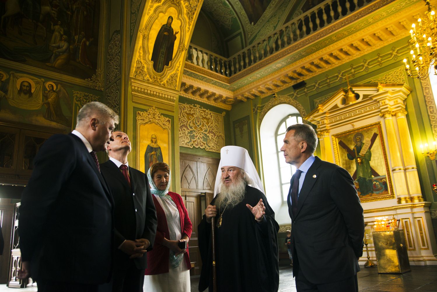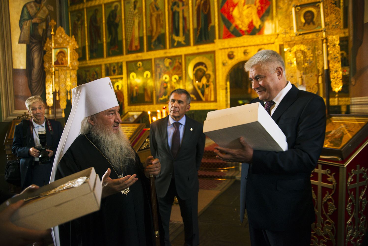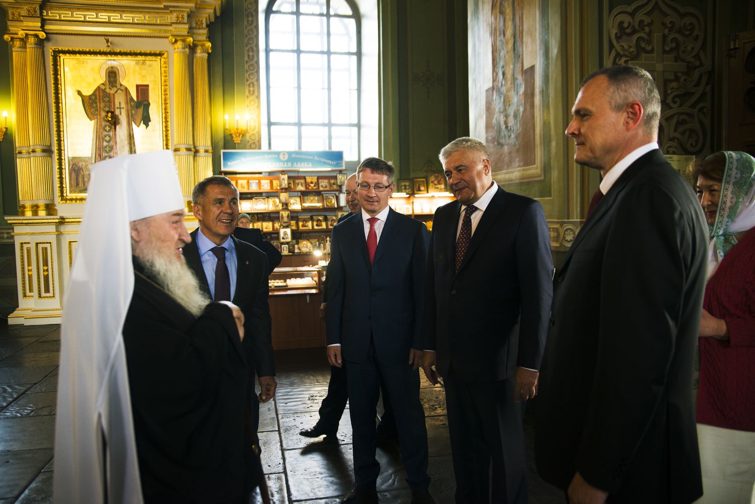 Руководителей силовых ведомств России и Белоруссии в соборном храме приветствовал митрополит Казанский и Татарстанский Феофан. Глава Татарстанской митрополии рассказал об истории Казанской епархии, восстановлении древних храмов на её территории и поделился мнением об уровне межконфессионального диалога в регионе.