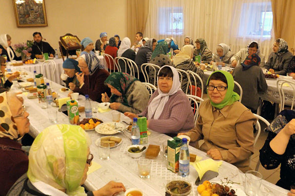 Обед прошел в дружеской, объединяющей атмосфере. Священнослужители приходов благочиния, прихожане архиерейского подворья и гости храма собрались в большой и уютной трапезной. Среди гостей в этот день особое место занимала младшая группа воскресной школы храма в честь Веры, Надежды и Любови. Перед трапезой для воспитанников, их родителей и преподавателей директор воскресной школы «Апостол» иерей Артемий Глущенко провел экскурсию по архиерейскому подворью.