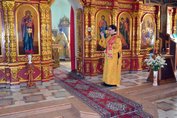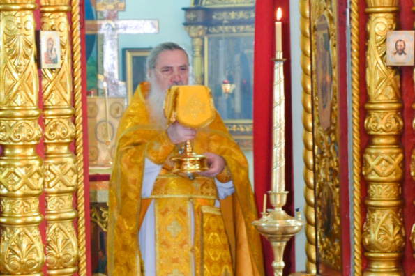 По окончанию Литургии священнослужители и прихожане поздравили настоятеля Троицкого храма протоиерея Валентина Кострина с 20-летием служения в этом приходе.