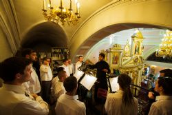 Богослужебные песнопения исполнялись двумя монастырскими хорами: мужским под управлением Дениса Рогова и смешанным под управлением монахини Амвросии (Кочережкиной).