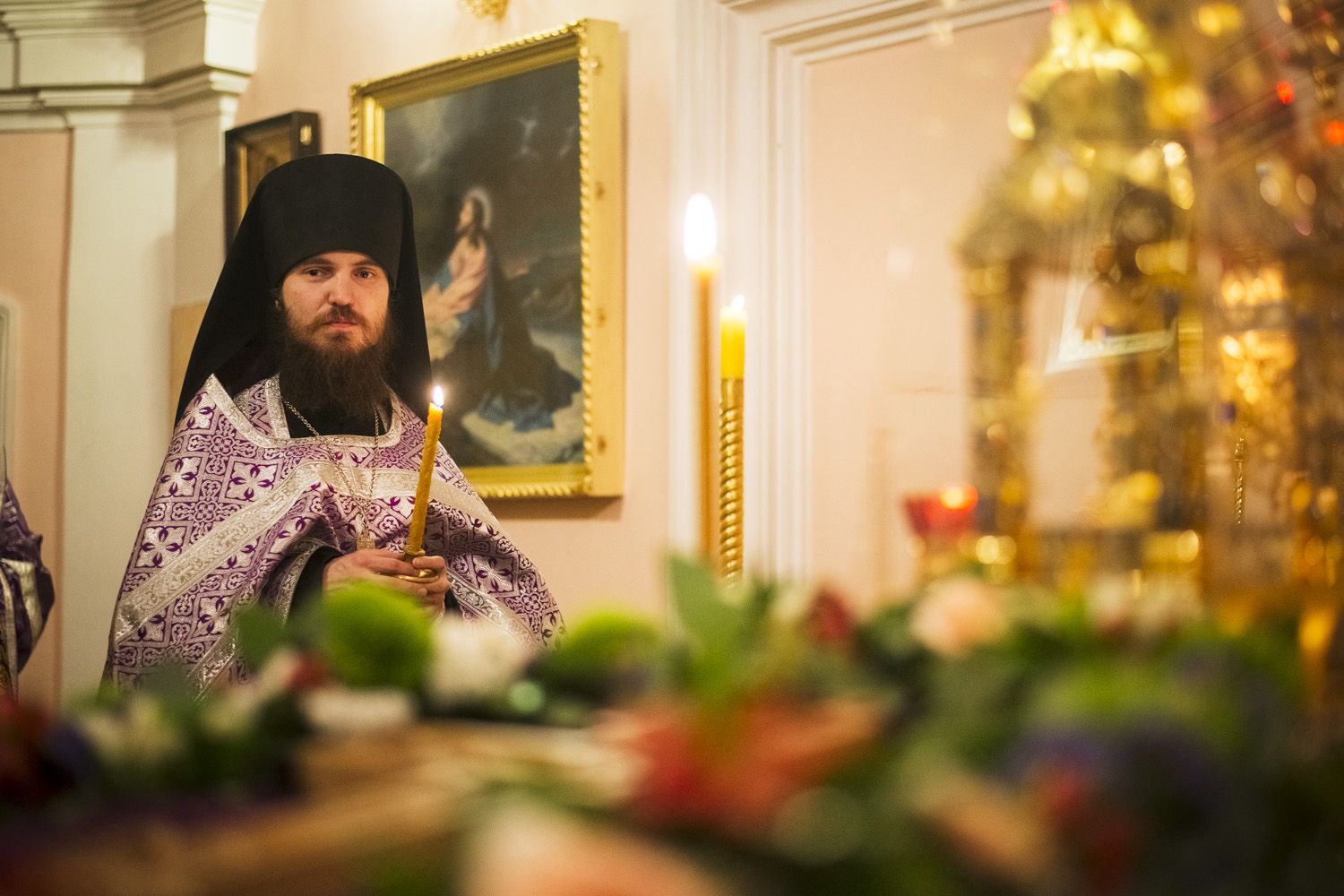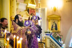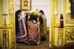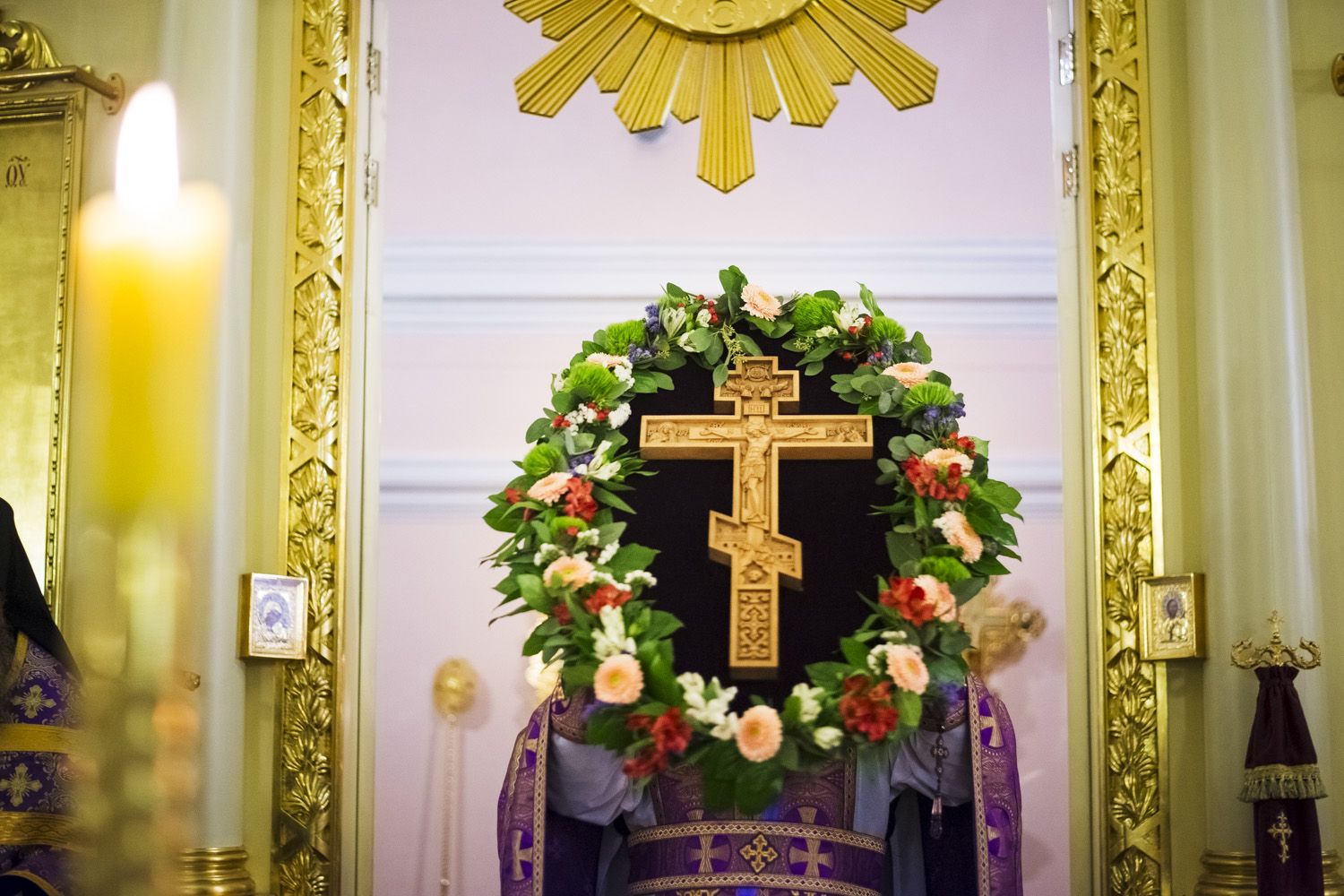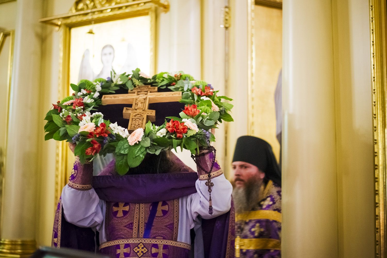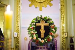 На всенощном бдении был совершён чин выноса Креста на середину храма для поклонения верующим, который зримо и духовно сближает современных христиан с тем днём, когда Крест Господень после трёх столетий забвения был обнаружен равноапостольной царицей Еленой и явлен народу.
