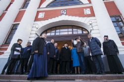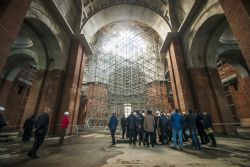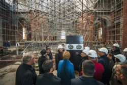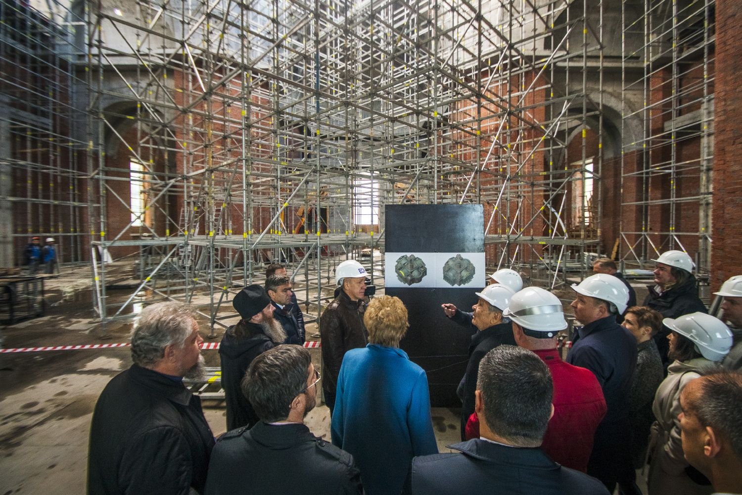 Строители рассказали участникам встречи о ходе работ и ближайших планах. На сегодняшний день возведение здания храма подходит к концу, идет процесс устройства кровли, большого и малых куполов, утепления дверных и оконных проемов. Параллельно создается монолитный каркас иконостаса. Строители продолжают трудиться в восстанавливаемом Пещерном храме собора. Его помещение готово к реставрационным работам, которые начнутся после получения от столичного Института реставрации ГОСНИИР заключения по температурно-влажностному режиму.