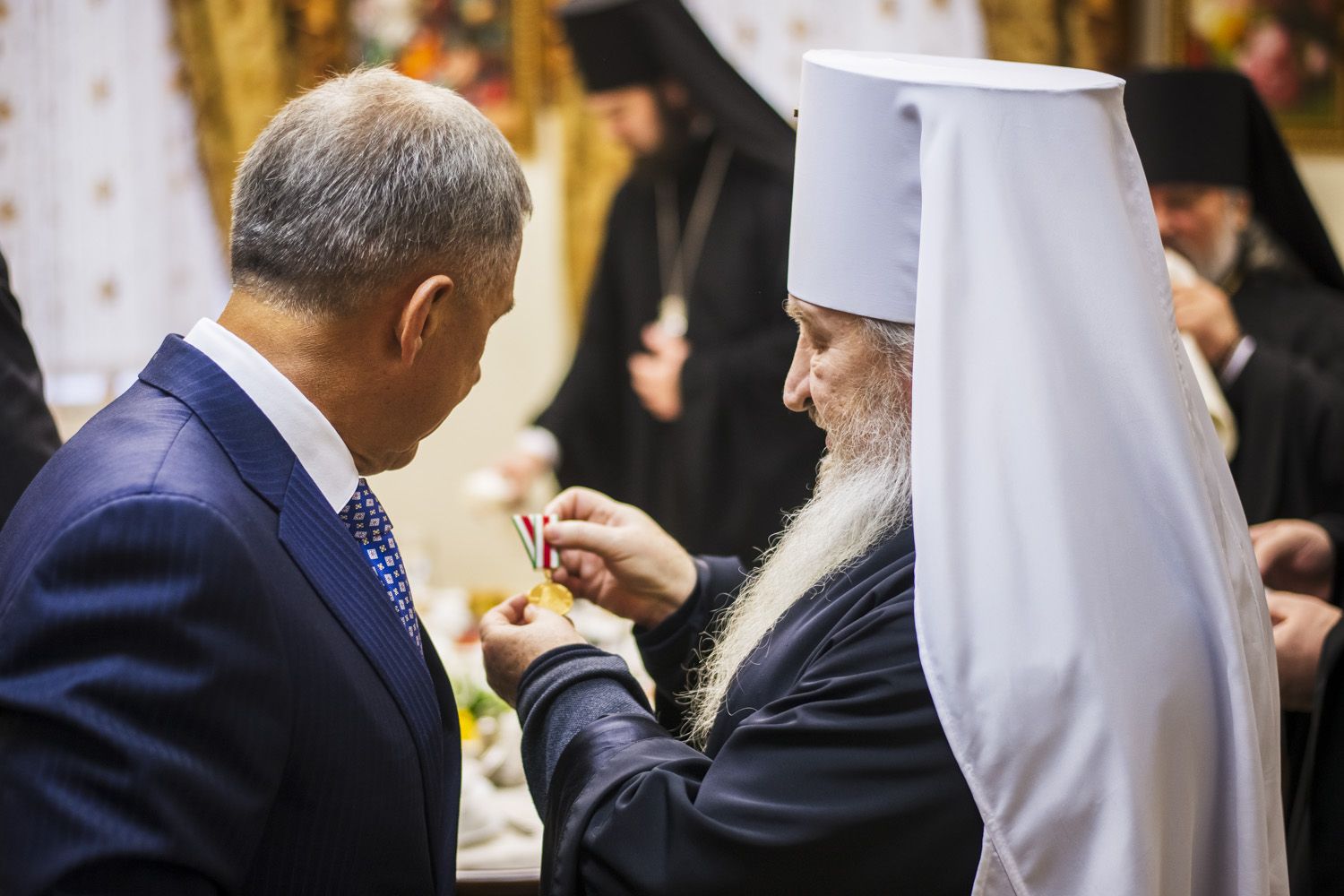 От имени Святейшего Патриарха Московского и всея Руси Кирилла Его Высокопреосвященство вручил Президенту республики юбилейную медаль «В память 100-летия восстановления Патриаршества в Русской Православной Церкви».