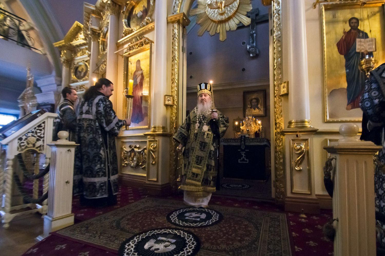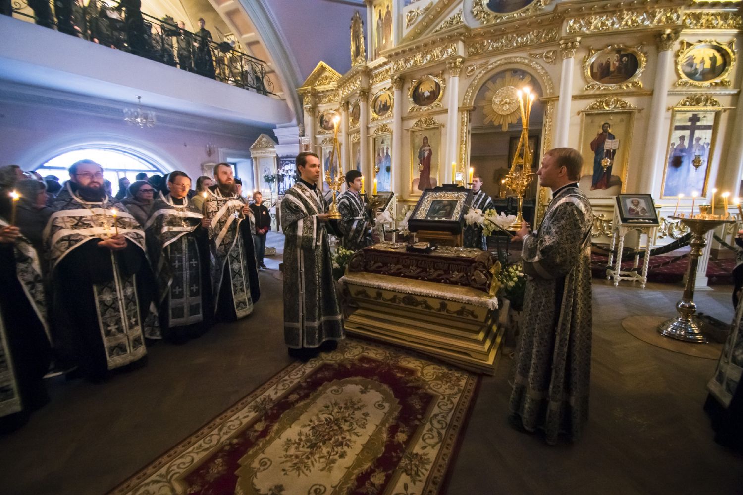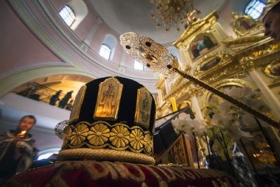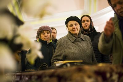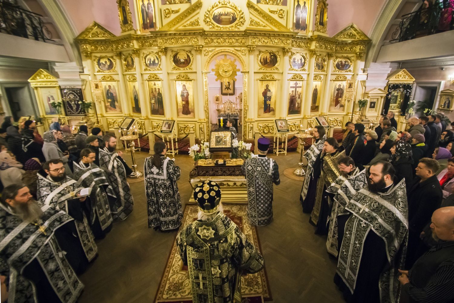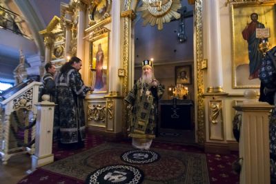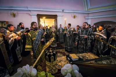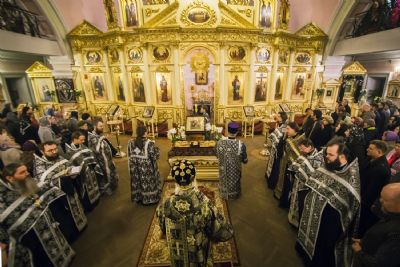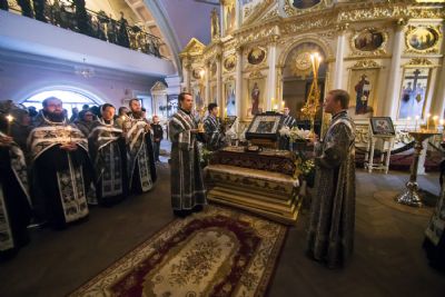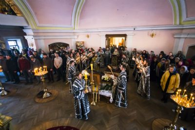 За богослужением Его Высокопреосвященству сослужили наместник игумен Марк (Виленский) с братией Богородицкой обители. Песнопения исполнили мужской хор под управлением Дениса Рогова и смешанный — под управлением монахини Амвросии (Кочережкиной).
