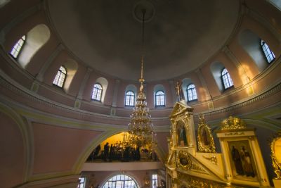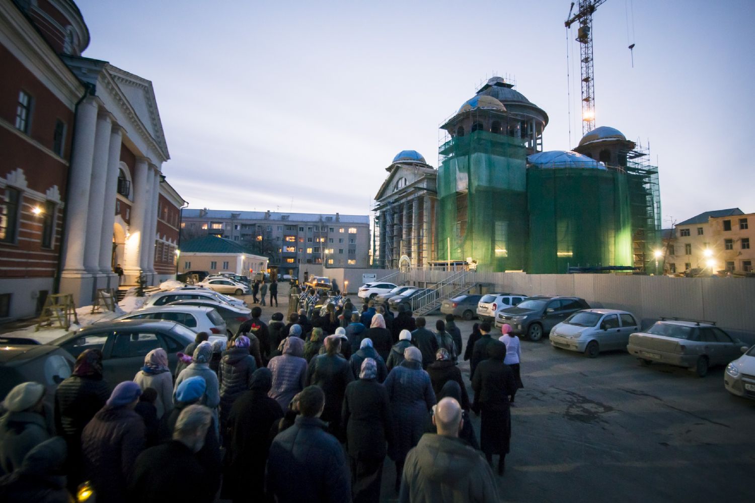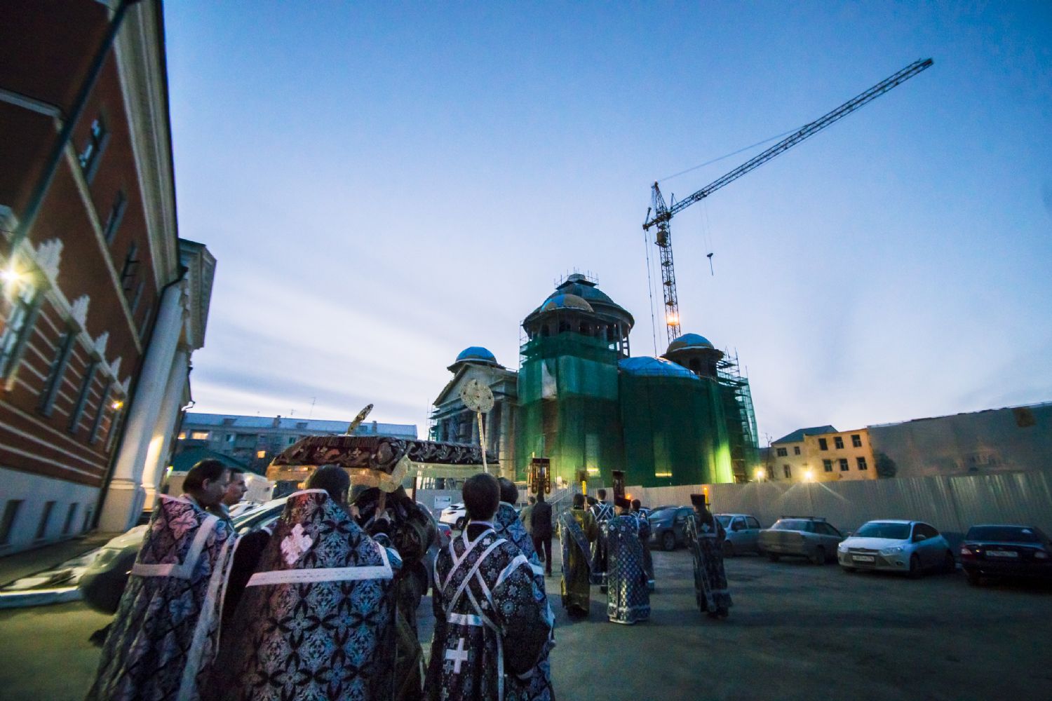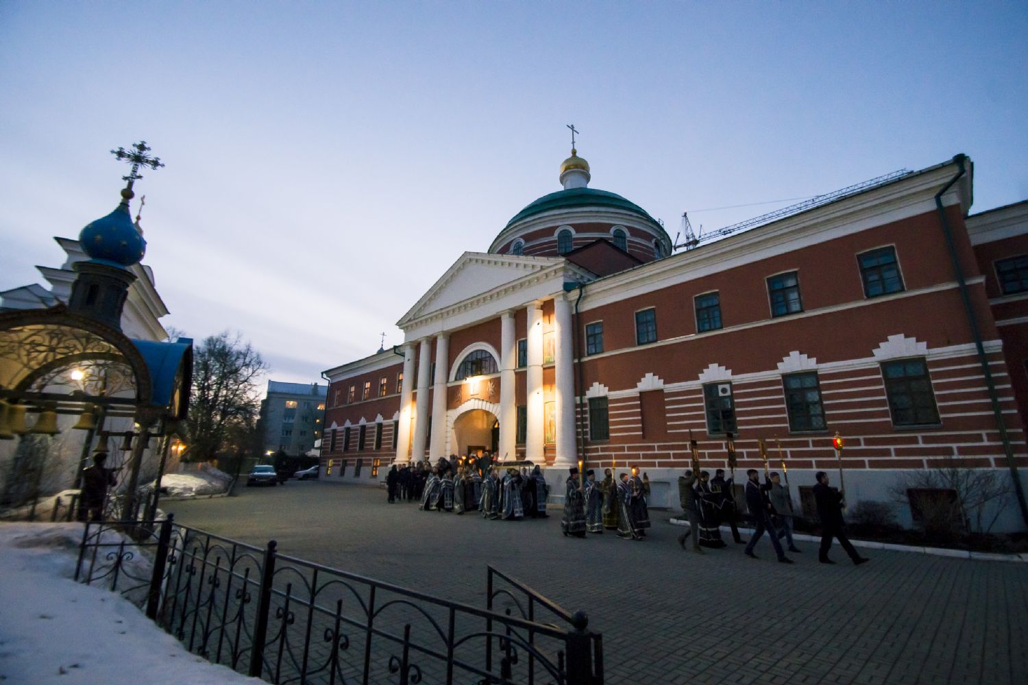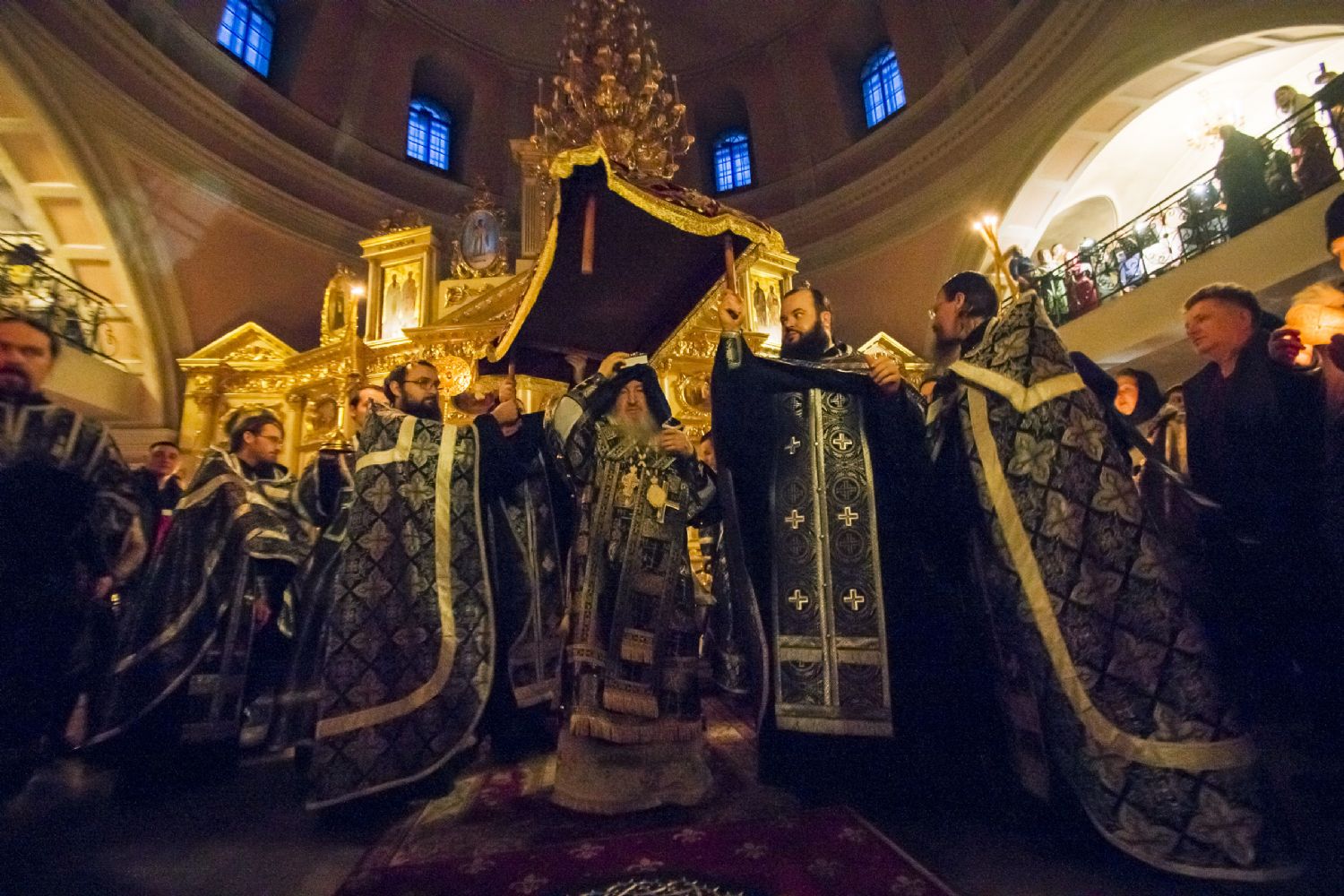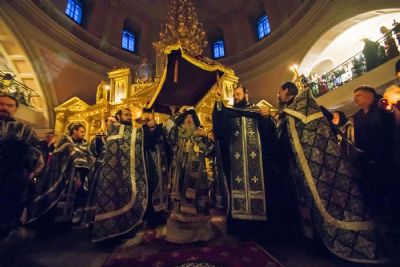 После великого славословия духовенство и прихожане во главе с правящим архиереем при пении «Святый Боже…» и погребальный перезвон прошли со Святой Плащаницей крестным ходом вокруг храма.