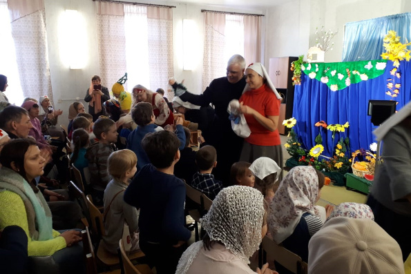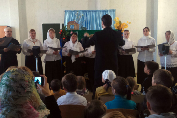Затем в актовом зале воскресной школы состоялся концерт для детей и их родителей. Народный хор Новоиерусалимского архиерейского подворья под руководством регента Тимофея Шагиахметова исполнил несколько церковных песнопений.