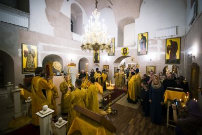 За вечерним богослужением Его Высокопреосвященству сослужили иеромонах Роман (Модин), благочинный IV Казанского округа протоиерей Владимир Пономарев, настоятель прихода преподобного Серафима Саровского города Казани протоиерей Димитрий Салков, клирик подворья иерей Максим Димаев.
