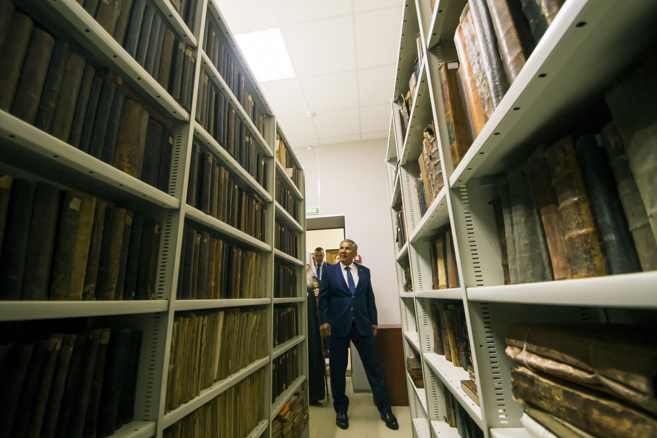 Затем глава республики посетил библиотеку духовной школы и фонд редких книг. Рустам Нургалиевич осмотрел помещение книгохранилища, где при соблюдении особых температурных параметров хранятся уникальные старинные книги по богословию, истории, философии и филологии из фондов библиотеки Казанской духовной академии, дореволюционных монастырских и приходских библиотек Казанской епархии, а также из личных собраний местного духовенства. Р.Н. Минниханов предложил организовать при необходимости совместную работу КазДС и Национального архива РТ в части обеспечения сохранности рукописей, их реставрации и оцифровки.