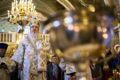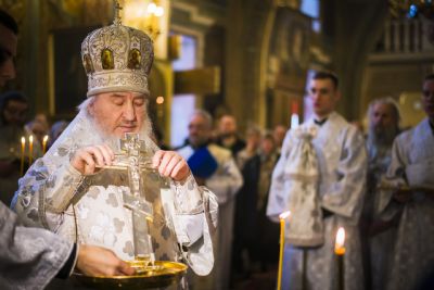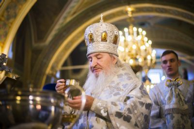 По заамвонной молитве при пении тропаря «Глас Господень…» правящий архиерей изнес на середину храма Святой Крест. Затем был совершен чин великого освящения воды и архипастырь окропил молящихся великой агиасмой.