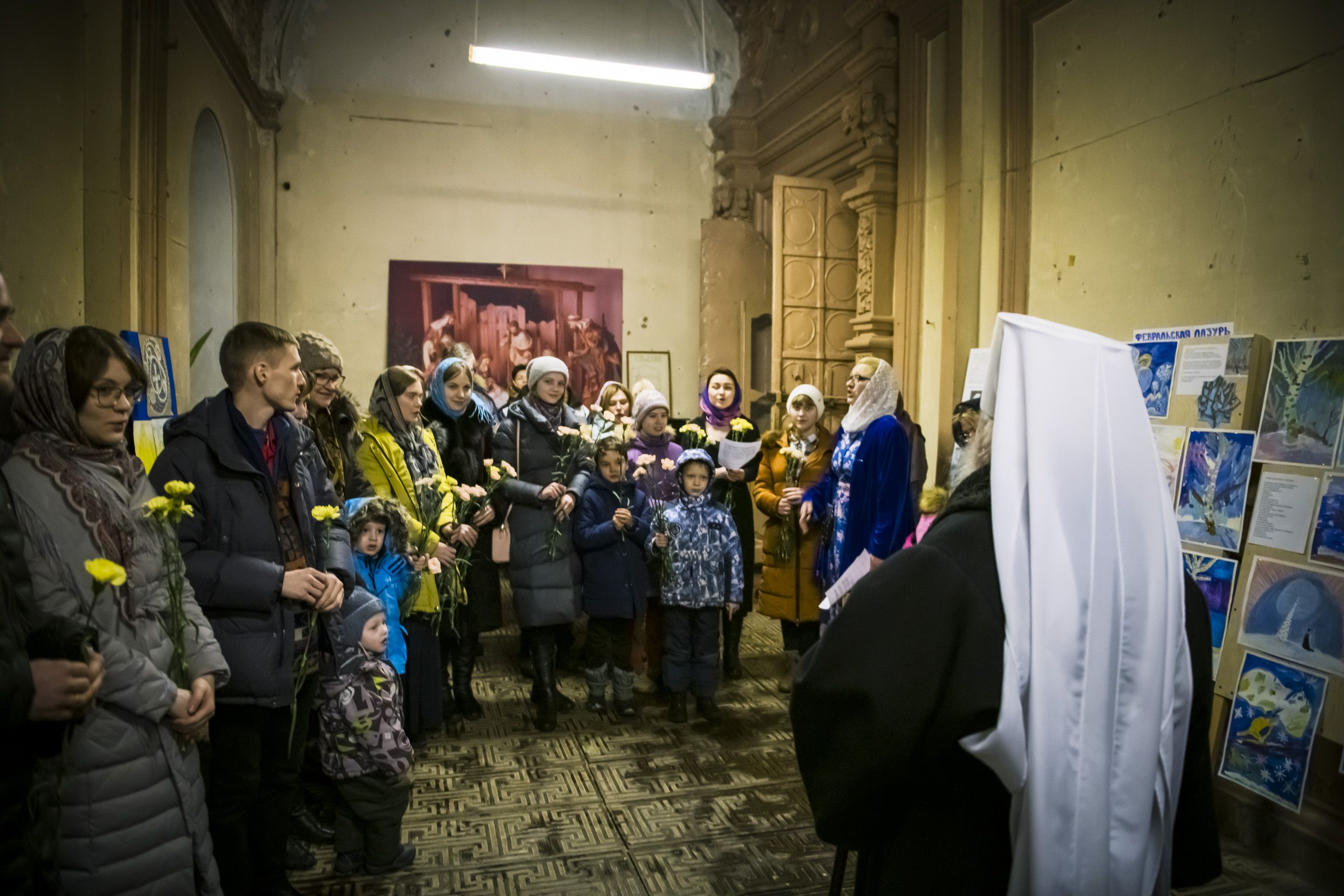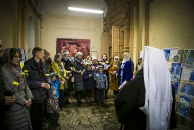 У входа в храм архипастыря приветствовали воспитанники воскресной школы и православная молодежь. Они спели праздничное песнопение и преподнесли владыке Феофану цветы.