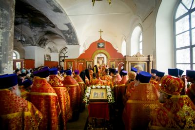 Благочинный I Казанского округа протоиерей Алексий Чубаков и благочинный Елабужского округа протоиерей Михаил Гречко изнесли из алтаря на середину храма образ священномученика Павла Дернова, пресвитера Елабужского, и его чад Бориса, Григория и Симеона. Глава Татарстанской митрополии при пении тропаря и кондака святым осенил иконой верующих.