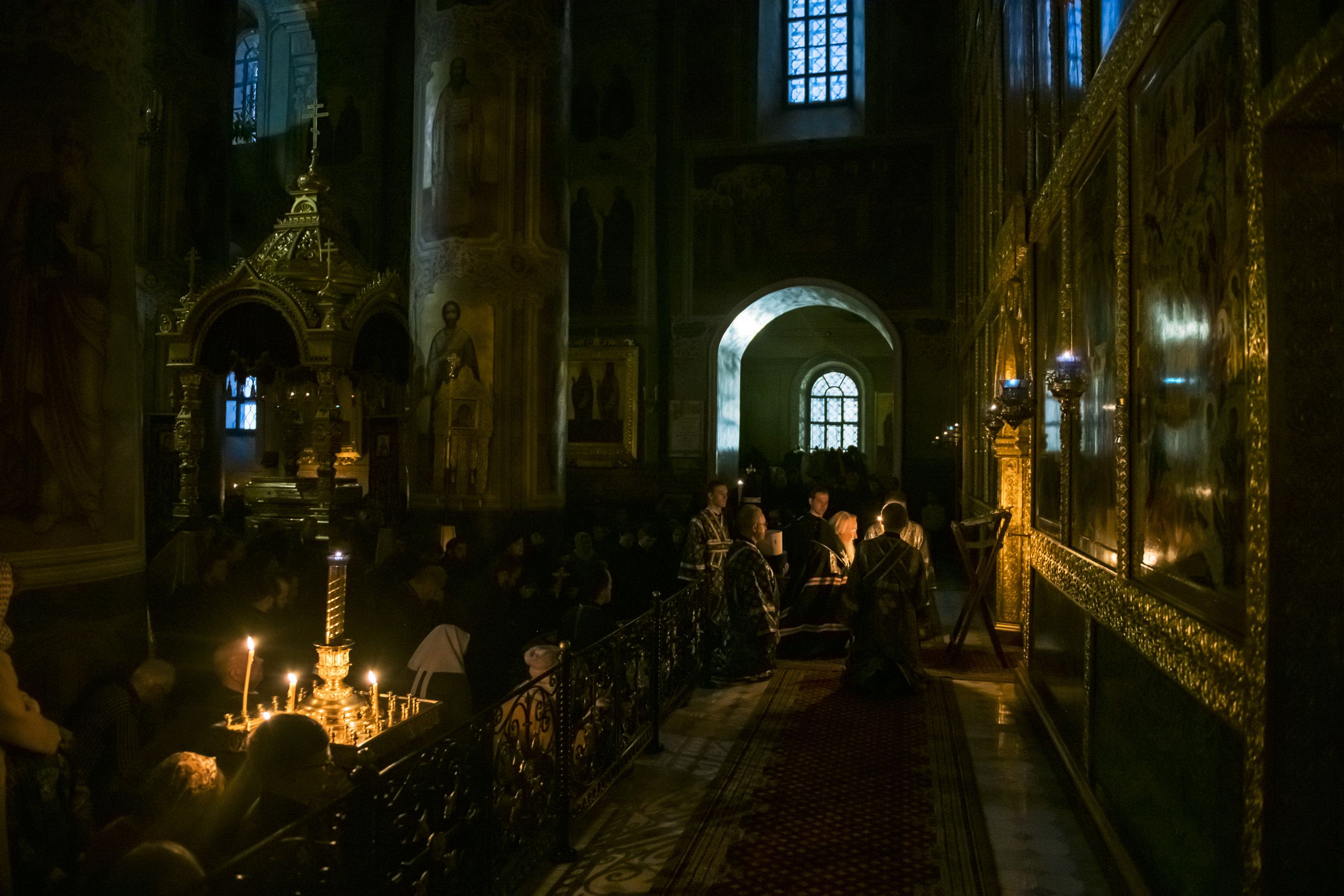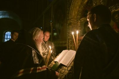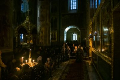 На вечерне был пропет великий прокимен «Не отврати лица Твоего…» По закрытии царских врат священнослужители переоблачились в темные одежды, а исполнение песнопений продолжилось великопостным напевом.
