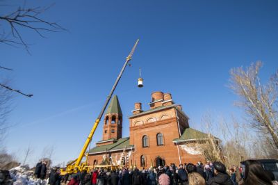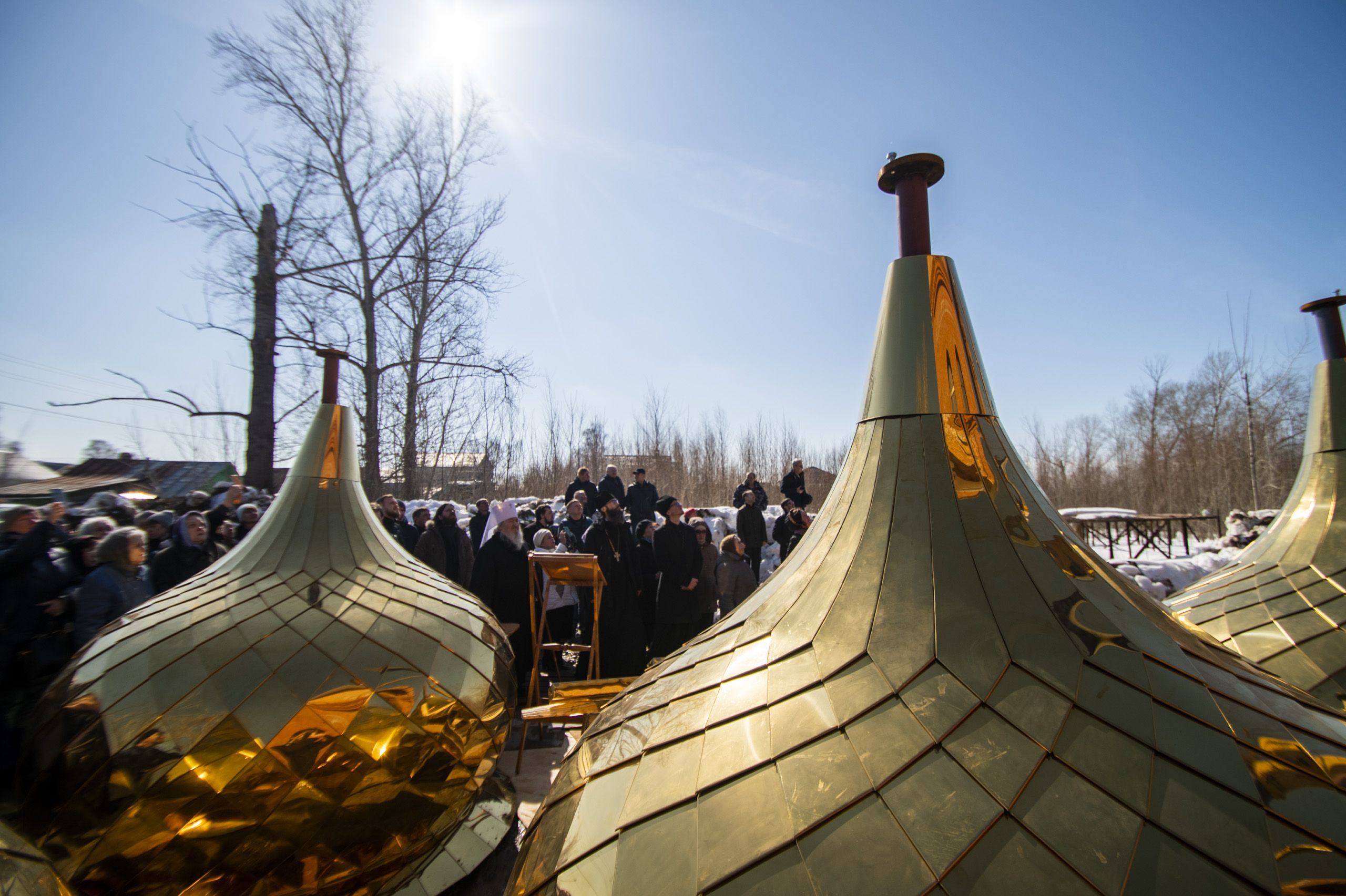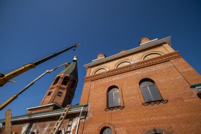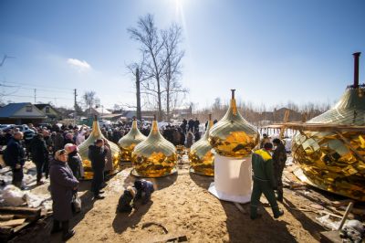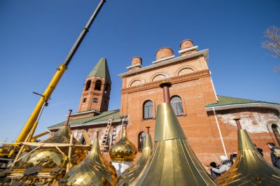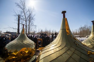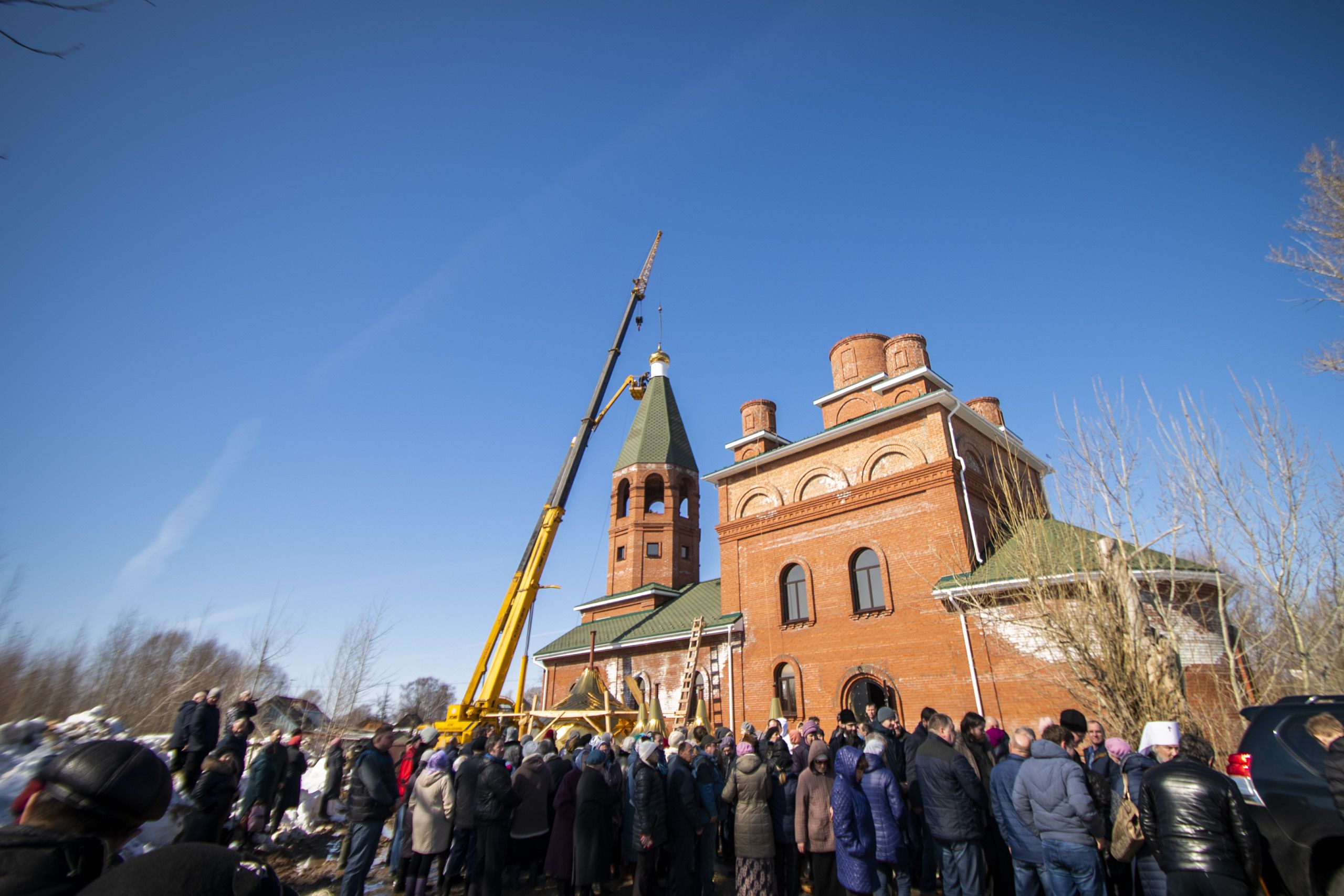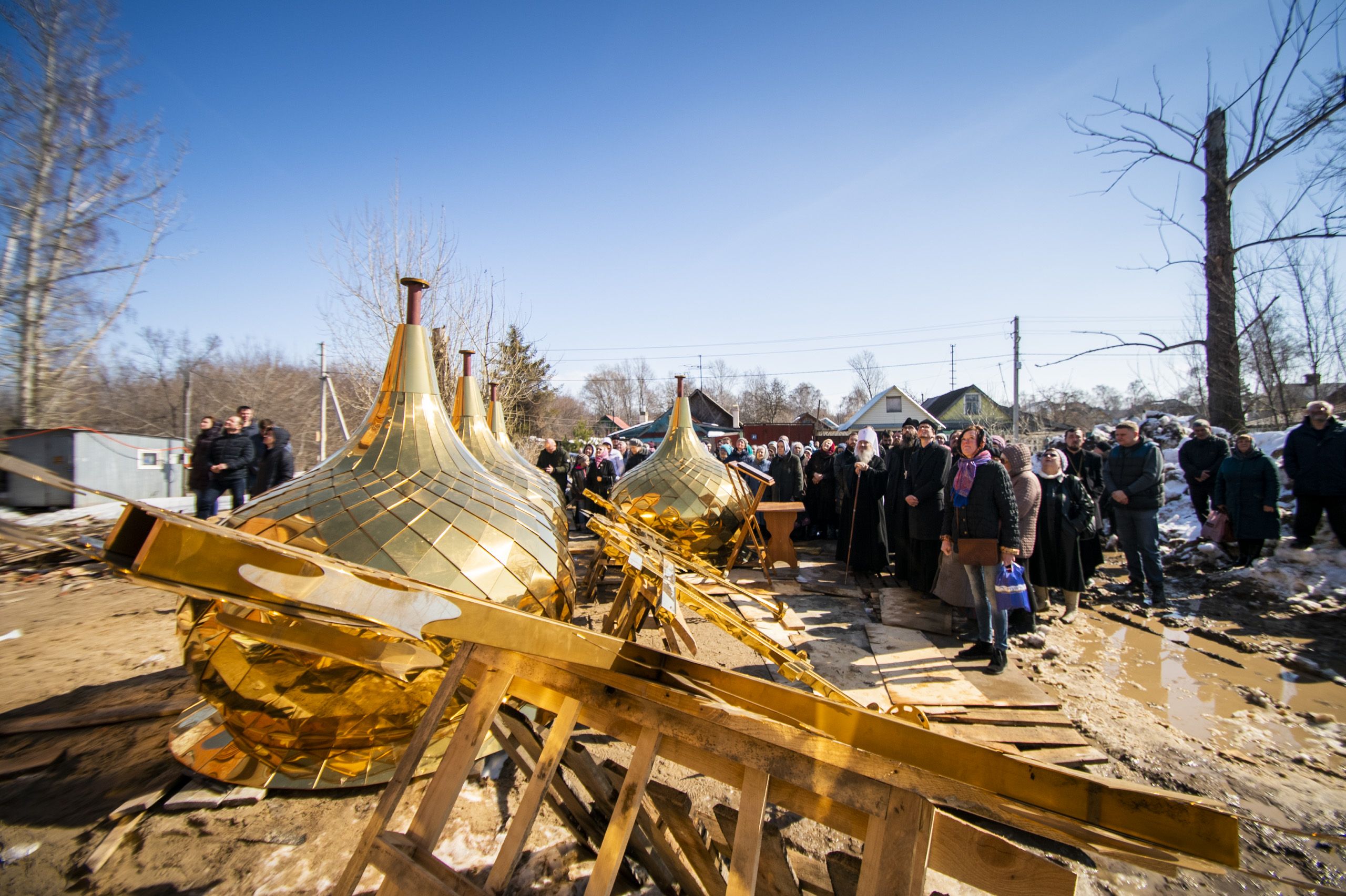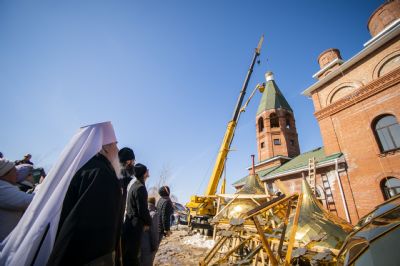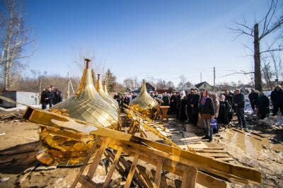 Затем под пение тропаря Животворящему Кресту «Спаси, Господи, люди Твоя…» на Ильинский храм был поднят первый купол с крестом. В течение дня рабочие установили на церковь все шесть куполов.