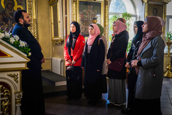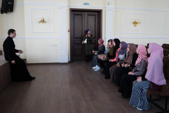 Студент I курса духовной семинарии Матвей Татаринов провел для гостей экскурсию по духовной школе. Учащиеся исламского института также посетили семинарский храм — о его устройстве и особенностях православного богослужения им рассказал проректор по воспитательной работе иеромонах Кирилл (Забавнов). Затем гости осмотрели учебные аудитории, библиотеку, актовый и спортивный залы, и посетили фотовыставку, посвященную Казанской иконе Божией Матери и Казанскому собору.