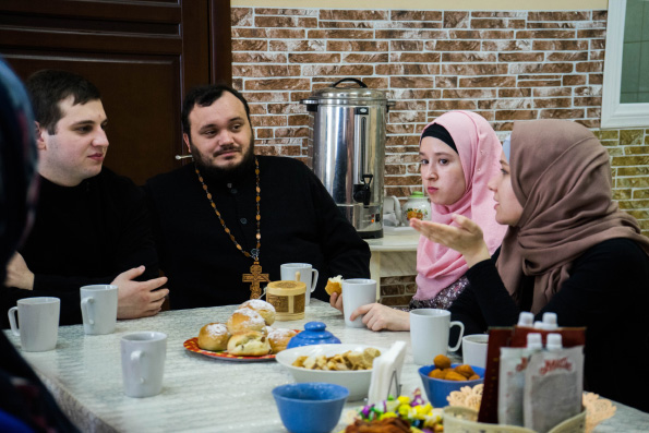 После этого в трапезной семинарии состоялось чаепитие, в котором приняли участие студенты двух вузов, отец Кирилл и преподаватель кафедры исламоведения Николай Ерундов. Учащиеся РИИ задавали вопросы, касающиеся христианского вероучения, учебного процесса и бытовой жизни студентов семинарии, а семинаристы интересовались исламскими традициями.