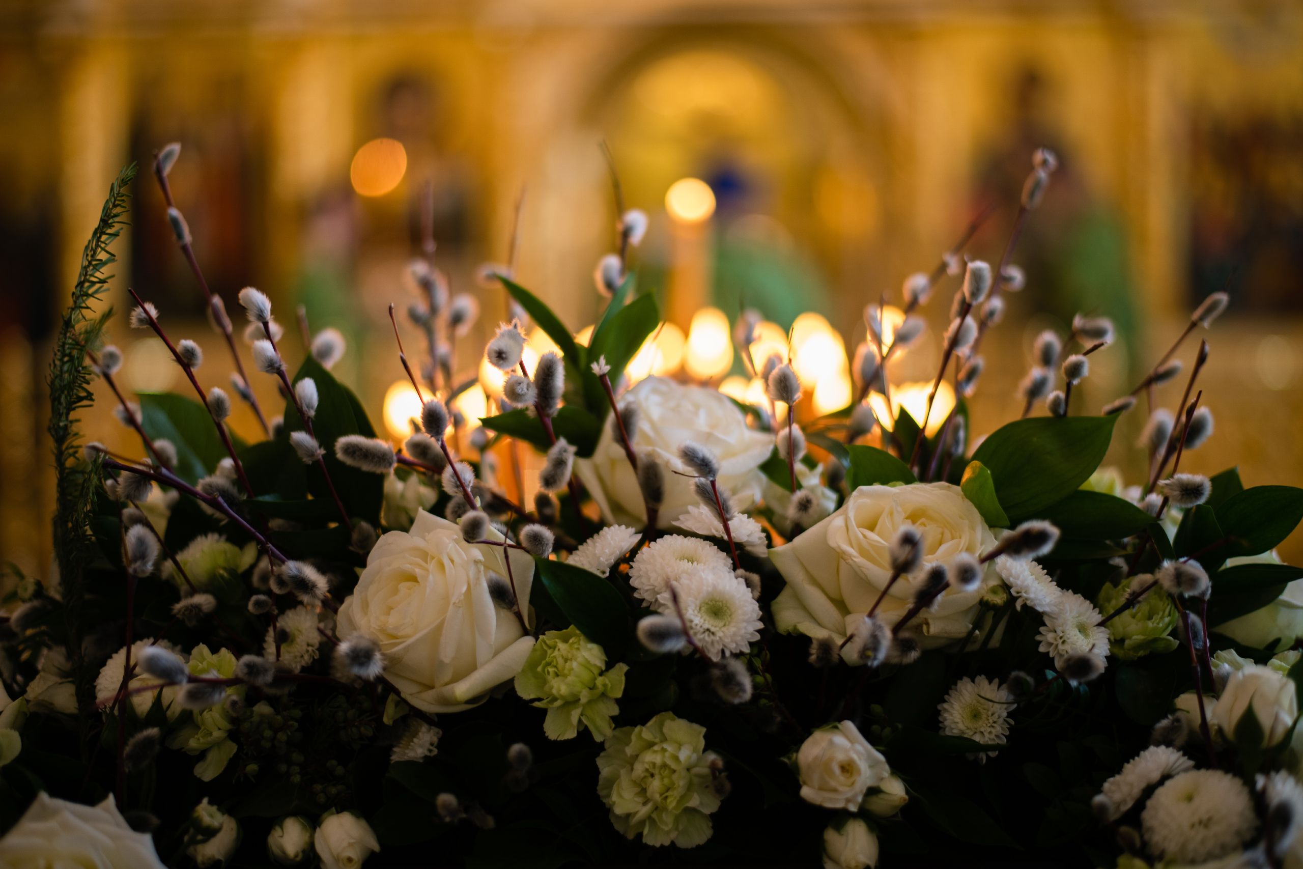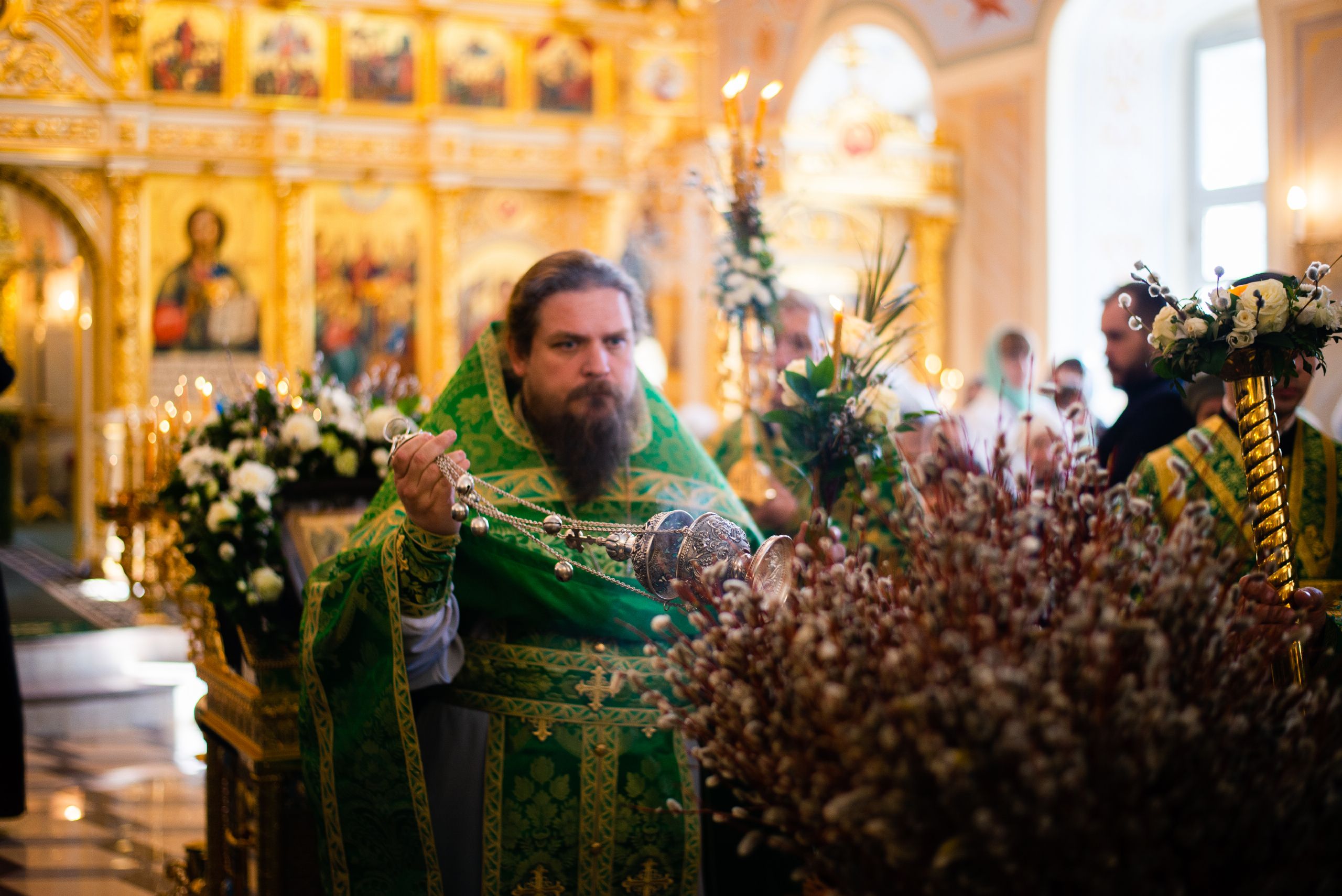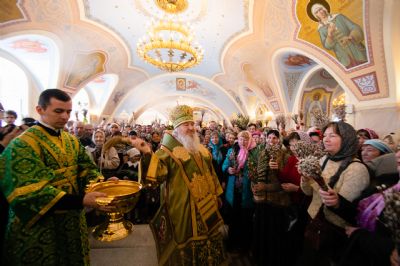 По заамвонной молитве духовенство пропело тропарь, кондак и величание празднику. Затем правящий архиерей прочитал молитву на освящение ваий и окропил вербы молящихся в храме.