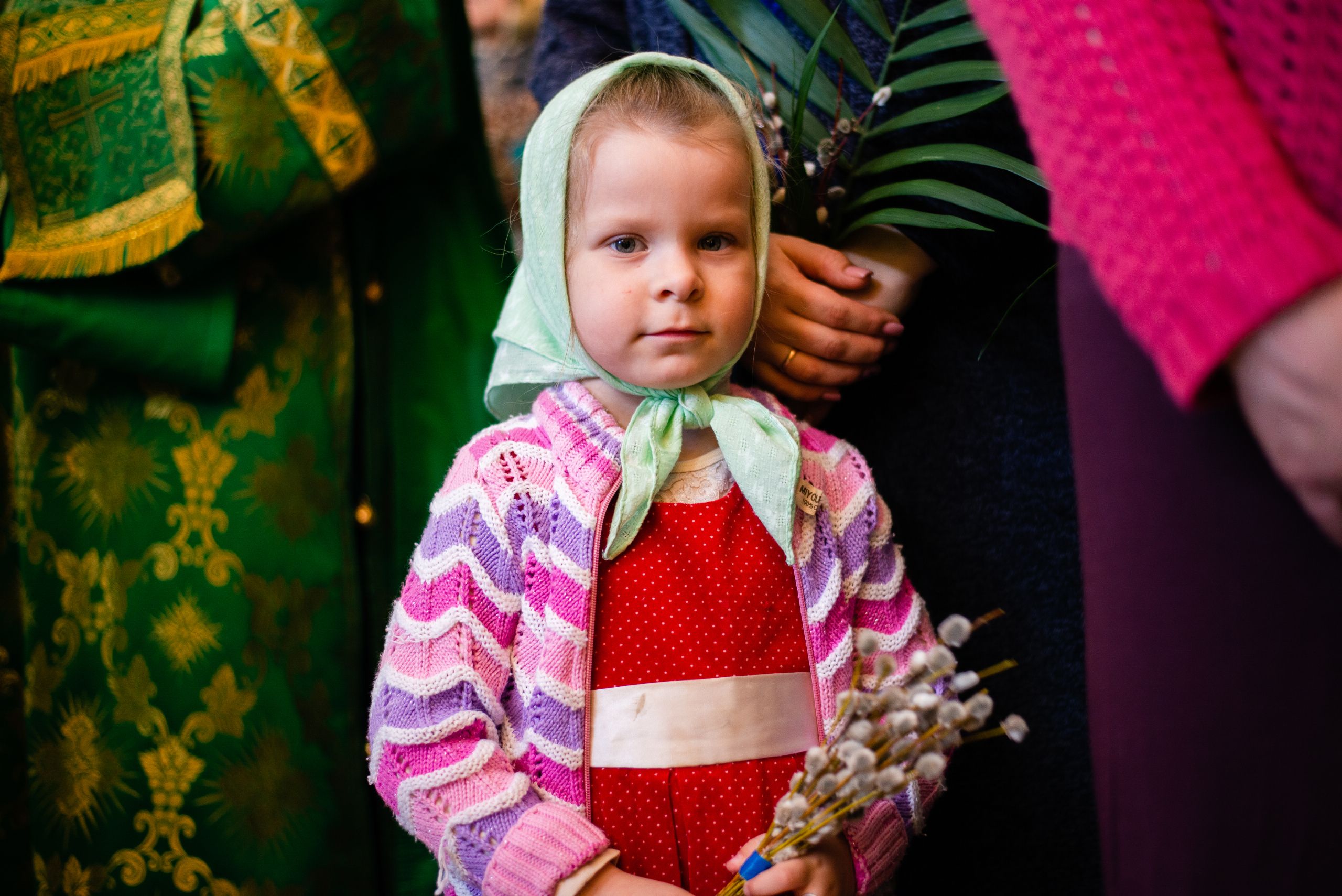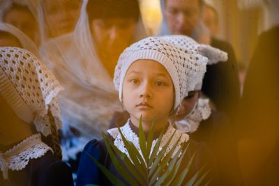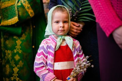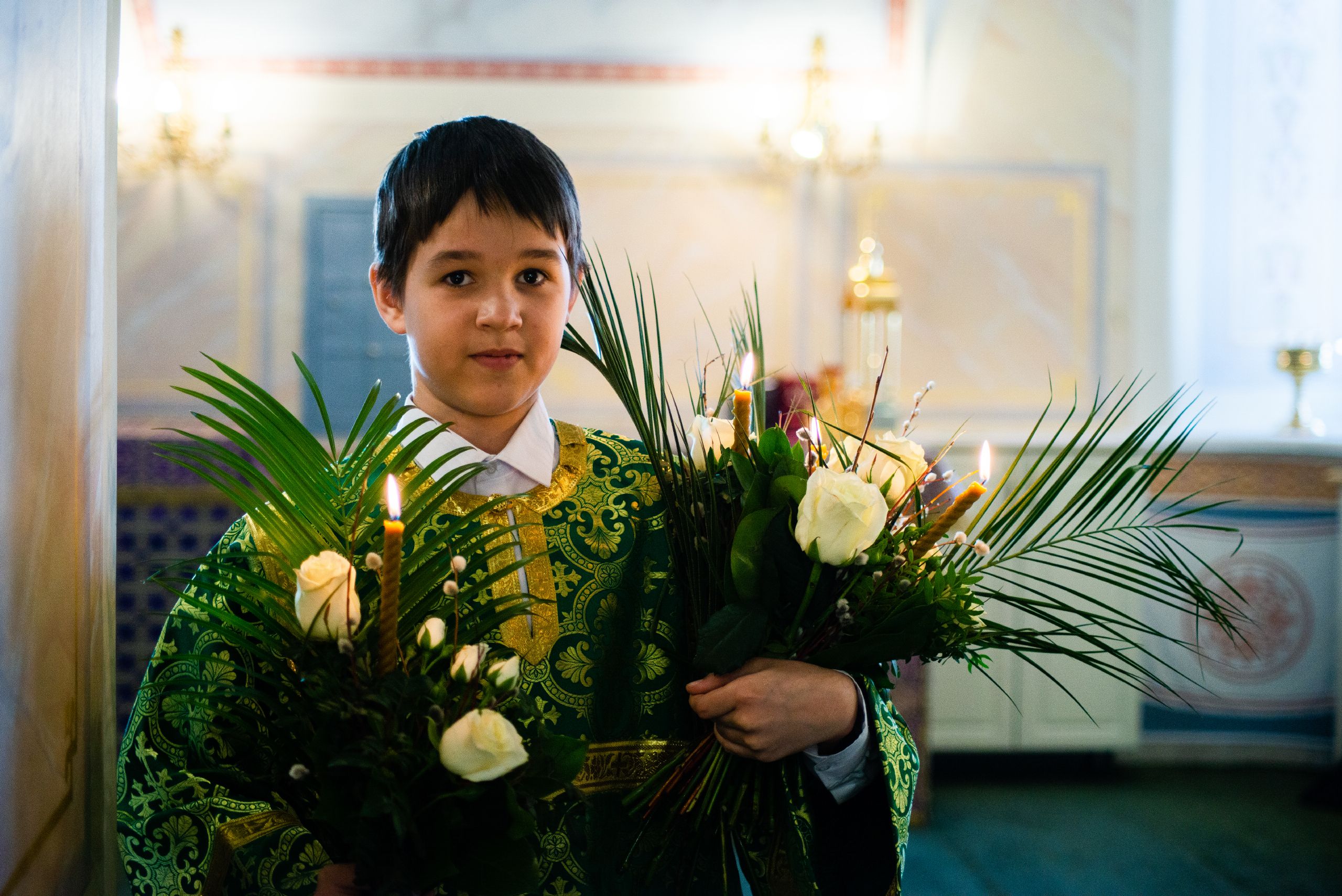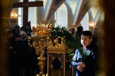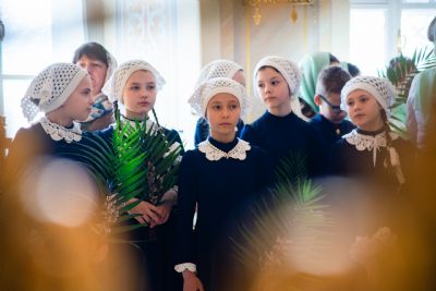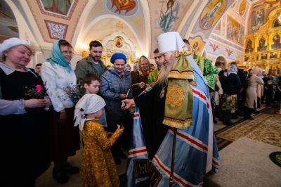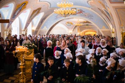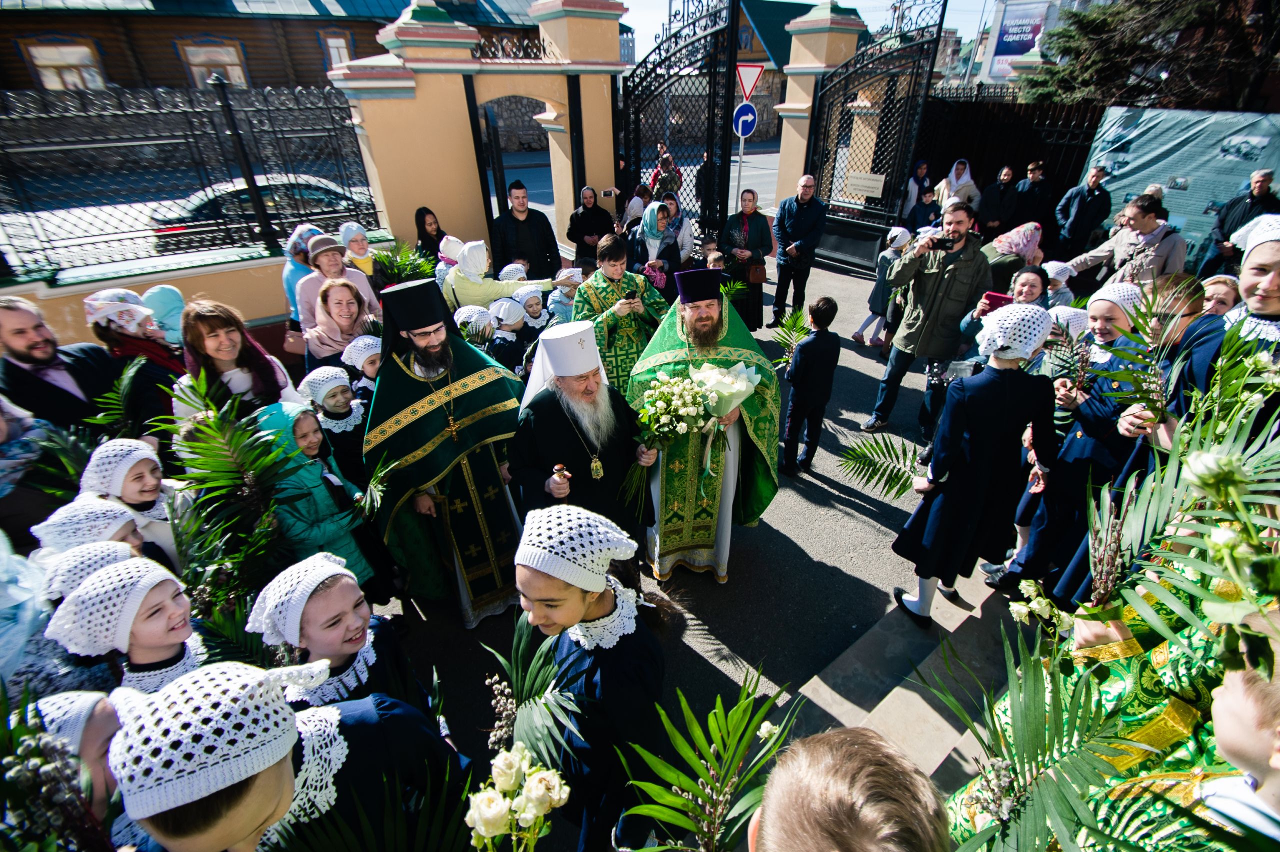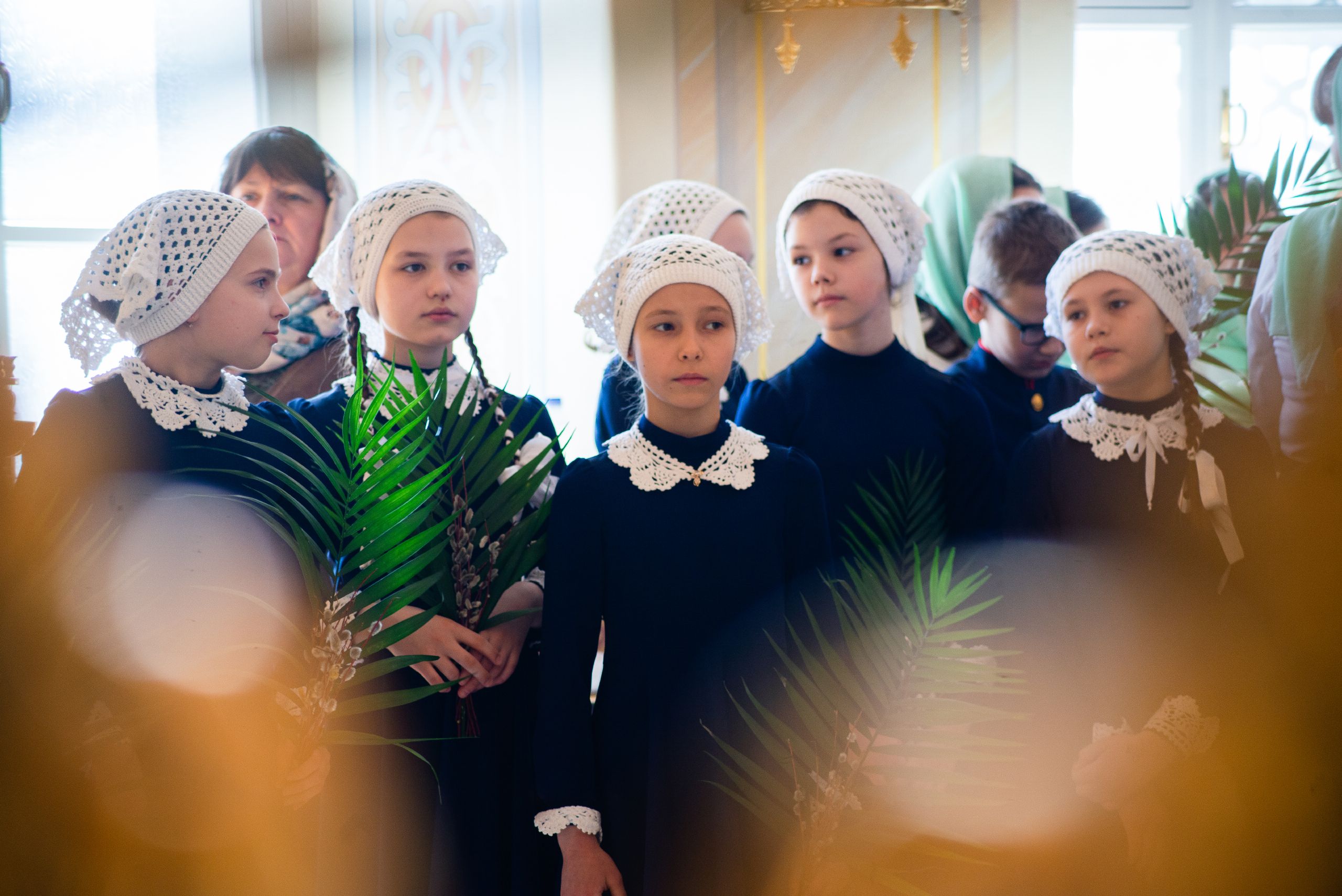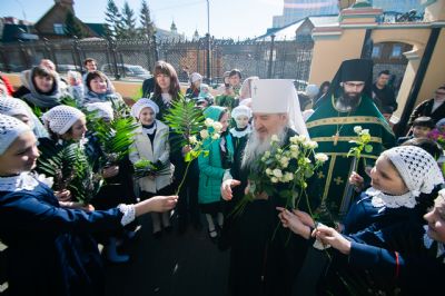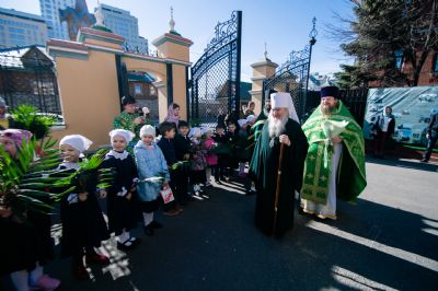 Перед началом богослужения у входа в храм архипастыря приветствовали воспитанники действующей при храме православной гимназии в честь святителя Гурия Казанского. Дети преподнесли владыке Феофану букеты цветов с ветвями вербы.