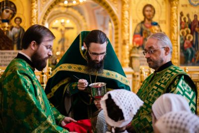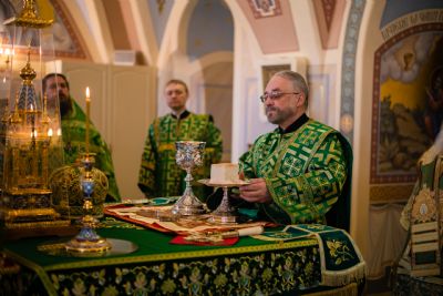 За Литургией главе Татарстанской митрополии сослужили благочинный I Казанского округа, настоятель храма протоиерей Алексий Чубаков, настоятель Введенского Кизического мужского монастыря игумен Пимен (Ивентьев), клирики прихода — иерей Александр Киреев, иерей Роман Мулеков, иерей Сергий Подопрелов.