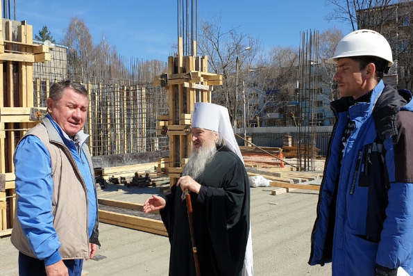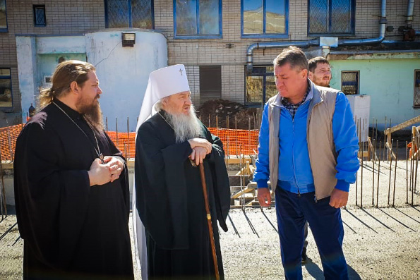 Митрополит Феофан в сопровождении генерального директора Свято-Гурьевской гимназии протоиерея Алексия Чубакова и генерального директора компании-подрядчика Рустема Лихачева проинспектировал ход строительных работ. К настоящему времени закончена заливка бетонного основания подвального помещения и первого этажа, ведется заливка каркаса здания и возведение перегородок.