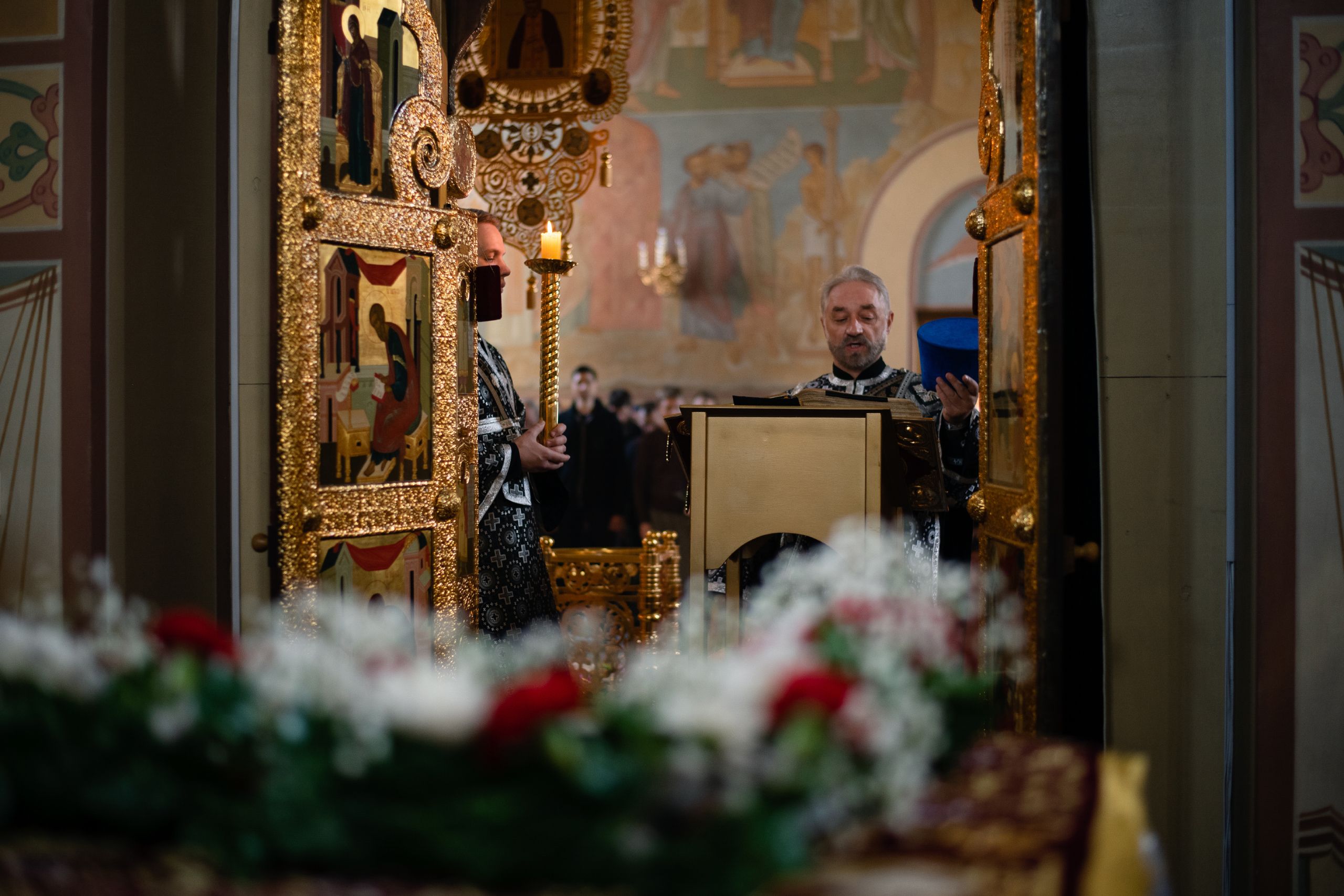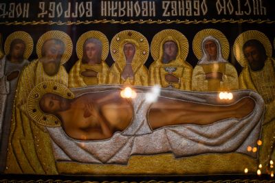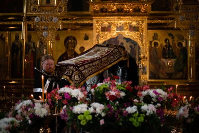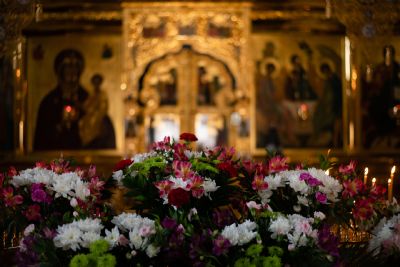 Во время пения тропаря «Благообразный Иосиф…» Святая Плащаница была изнесена духовенством из алтаря на середину храма.