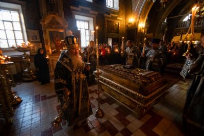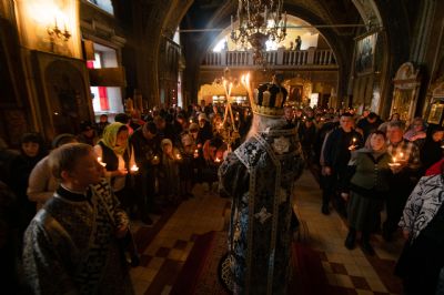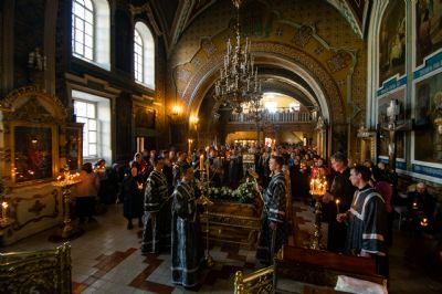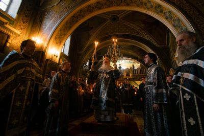 На середине храма у гробницы со Святой Плащаницей духовенство во главе с архипастырем прочитали особые надгробные стихословия — Непорочны с похвалами.