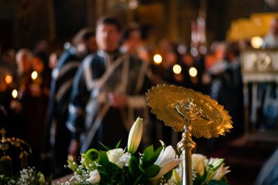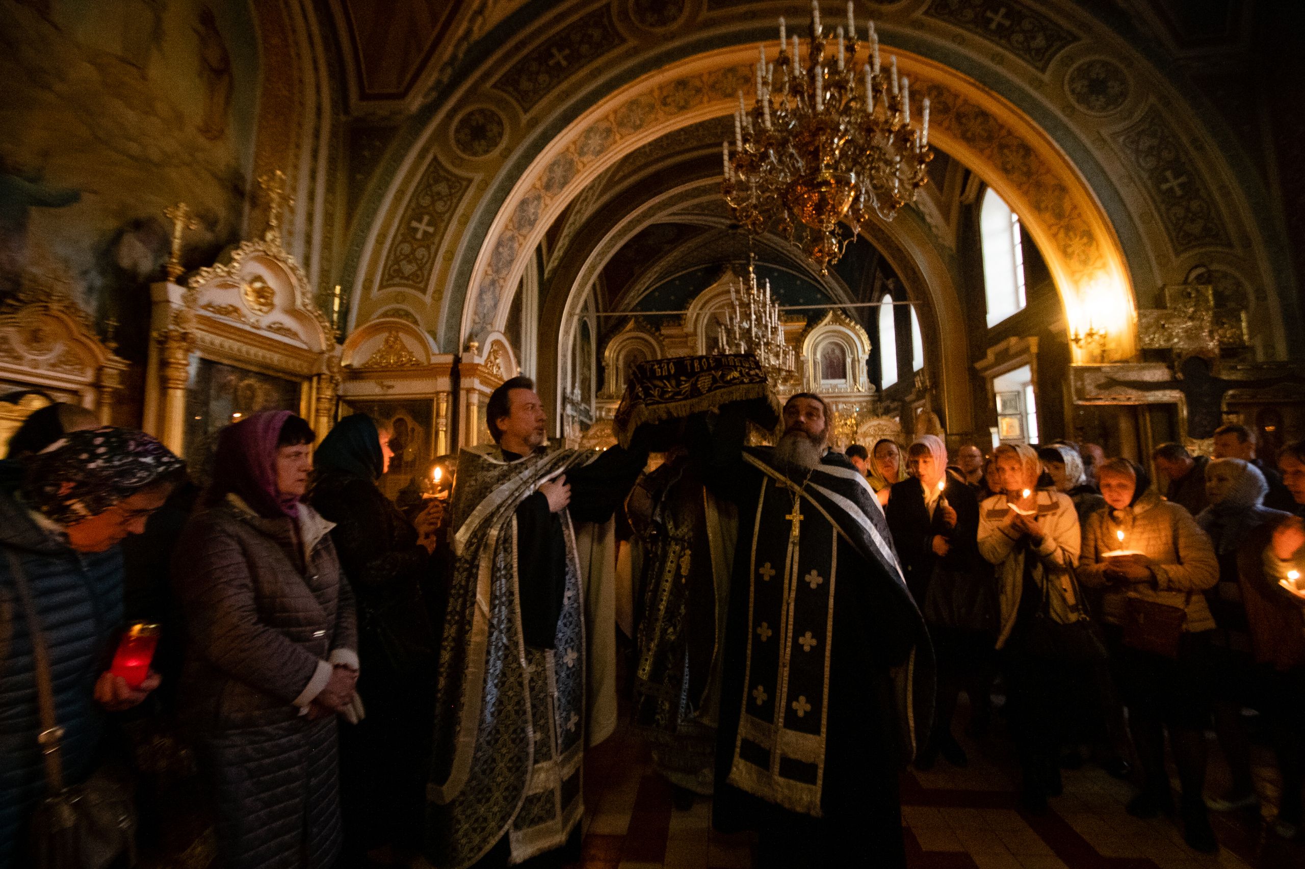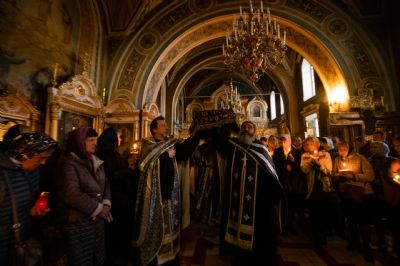 После Великого славословия состоялся крестный ход: с пением погребального «Святый Боже» священнослужители обнесли Плащаницу вокруг храма. Затем были прочитаны пророчества, паремии, Апостол и Евангелие.