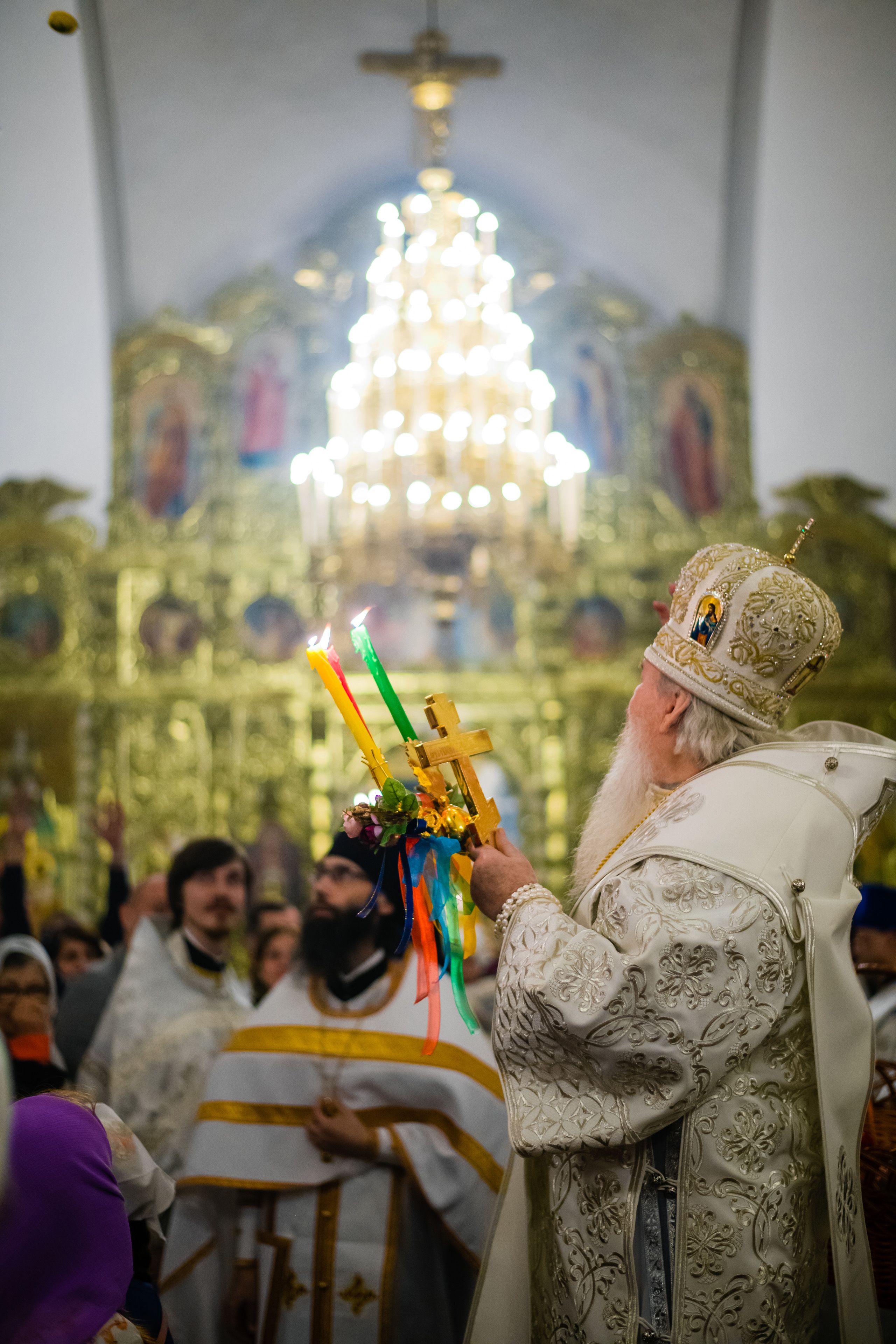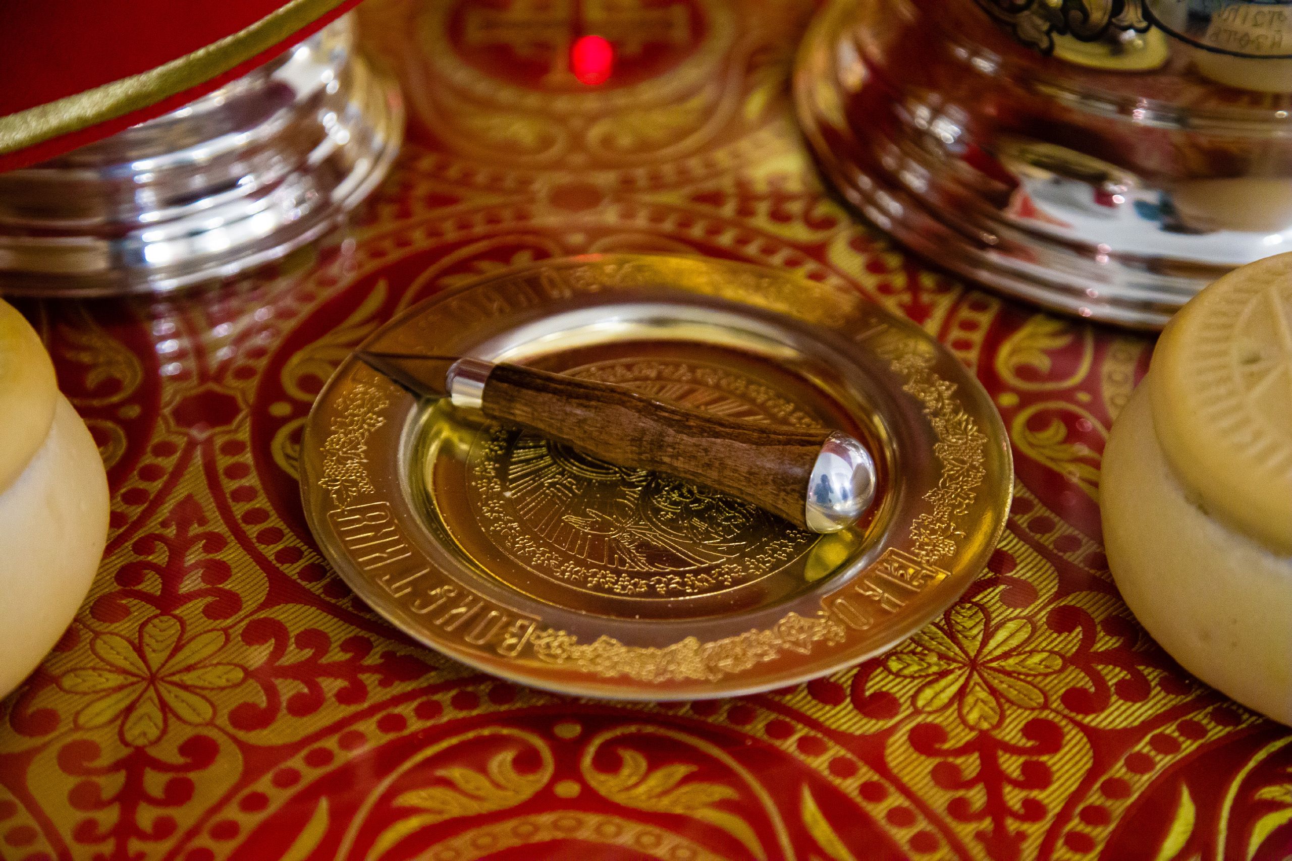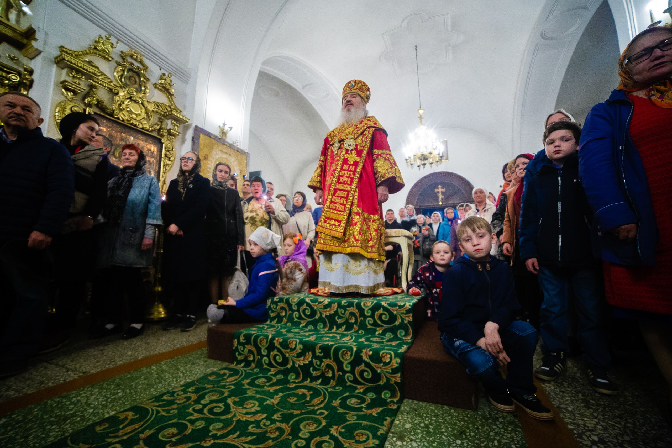 По заамвонной молитве правящий архиерей совершил освящение артоса и пасхальной снеди, принесенной верующими.