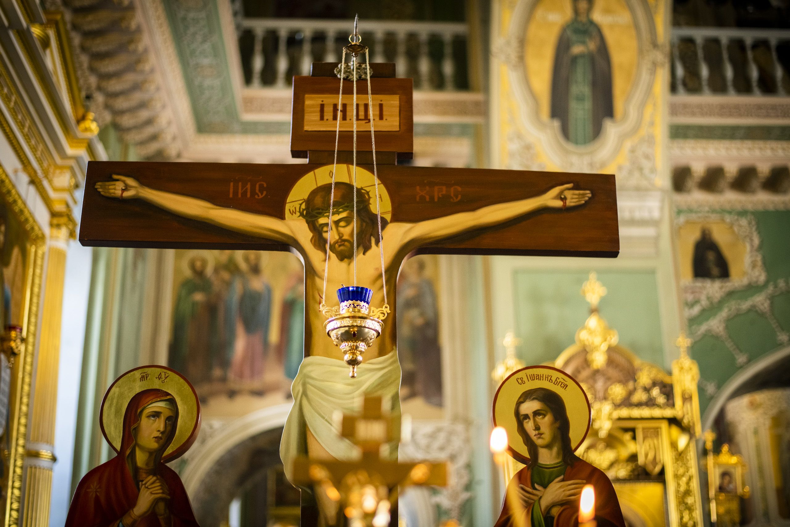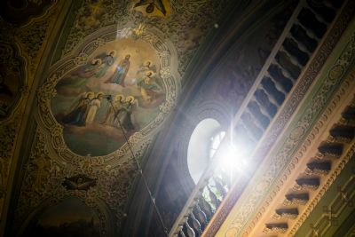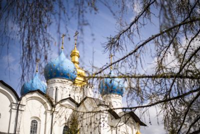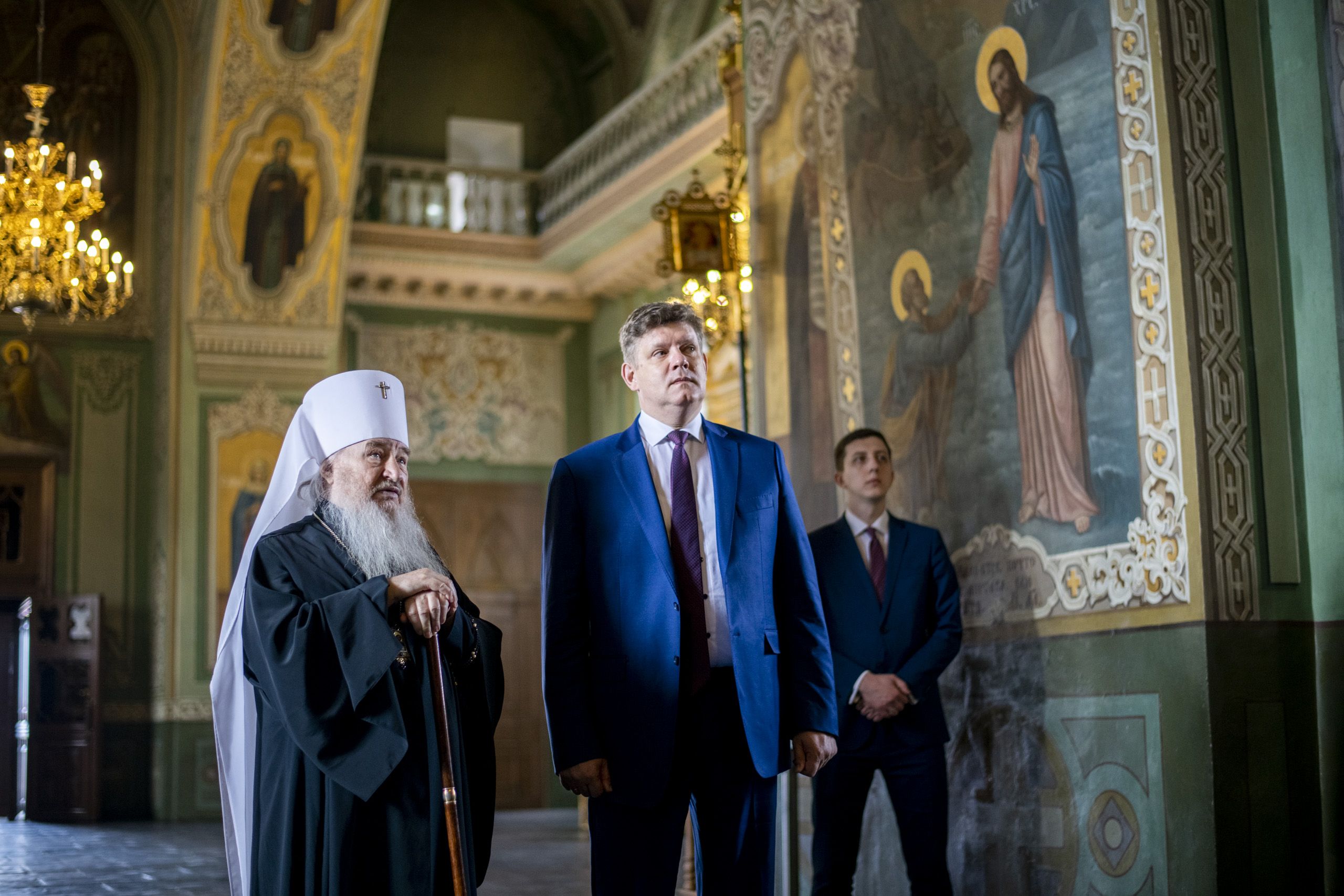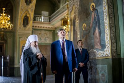 Глава Татарстанской митрополии встретил высокого гостя у входа в собор и провел экскурсию по храму. Митрополит Феофан рассказал об основных вехах истории собора — уникального памятника православного зодчества Казанского края, колыбели православной веры в Поволжье.