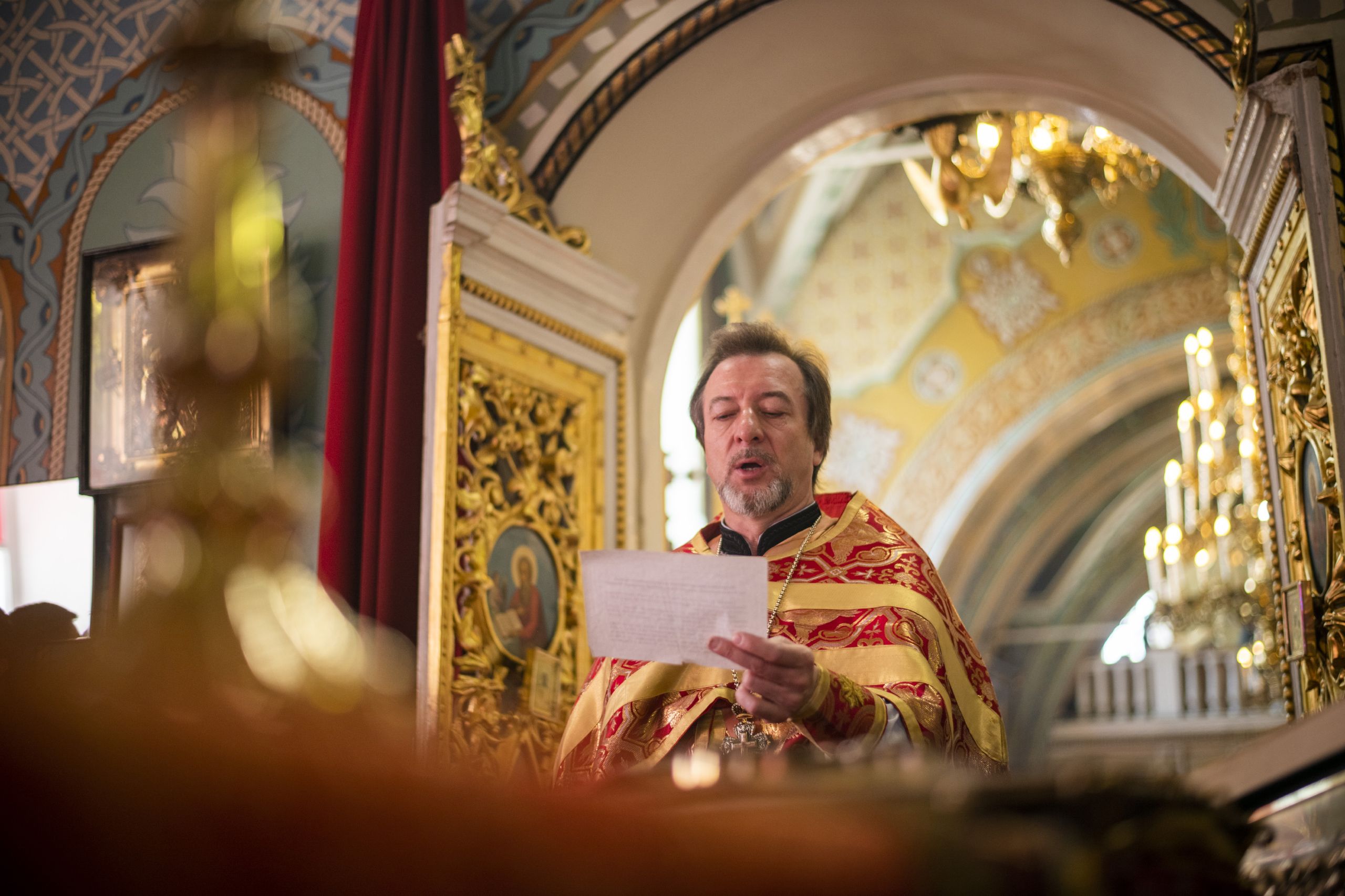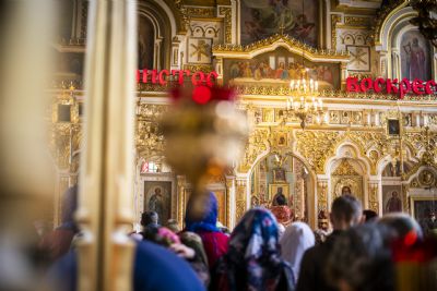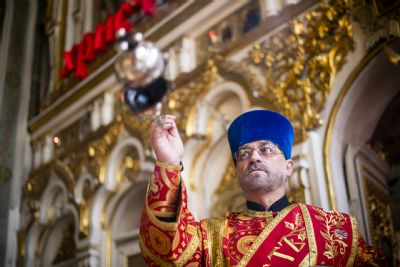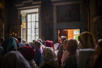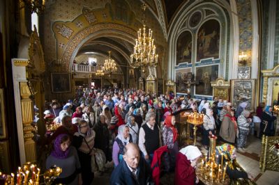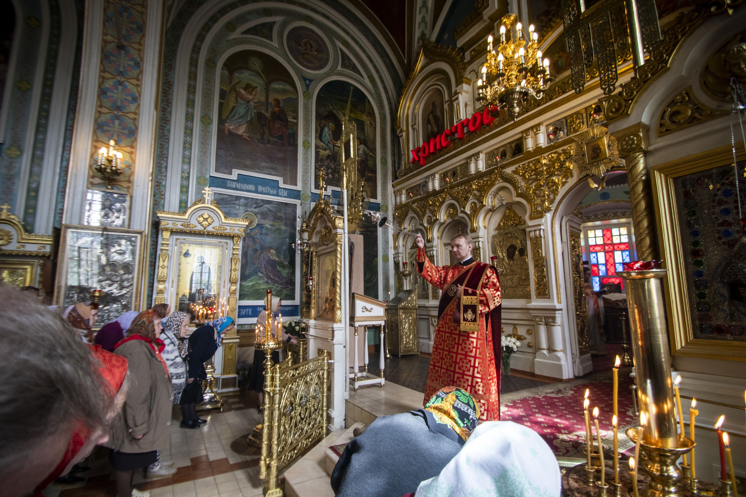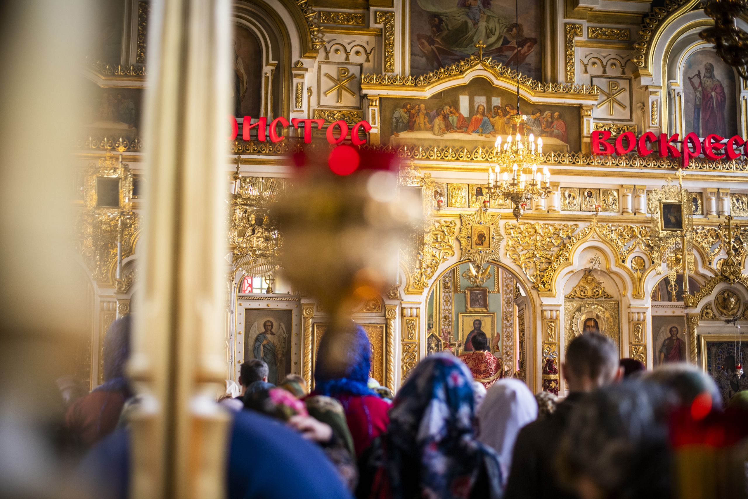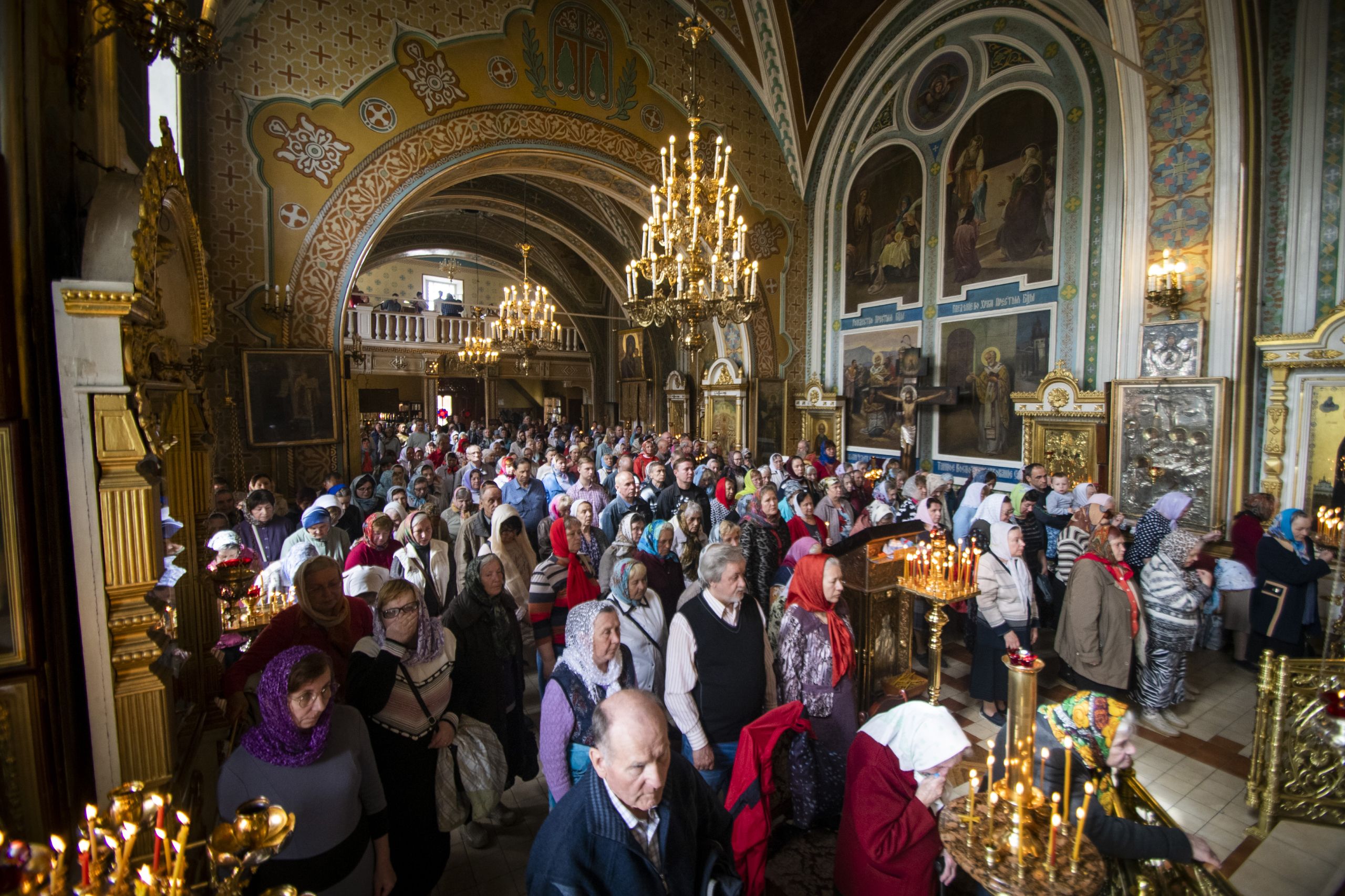 По окончании Литургии верующие прошли крестным ходом вокруг храма. У алтарной части собора священнослужители совершили малое освящение воды.