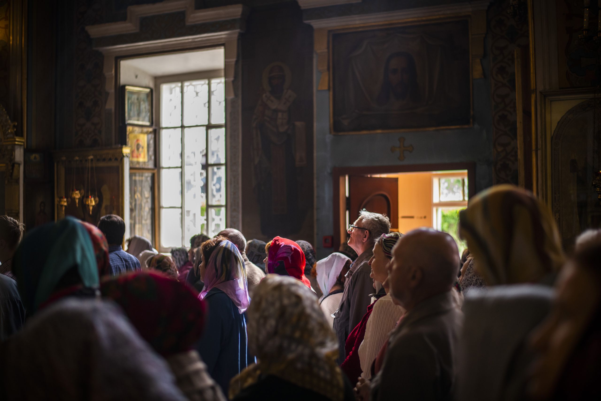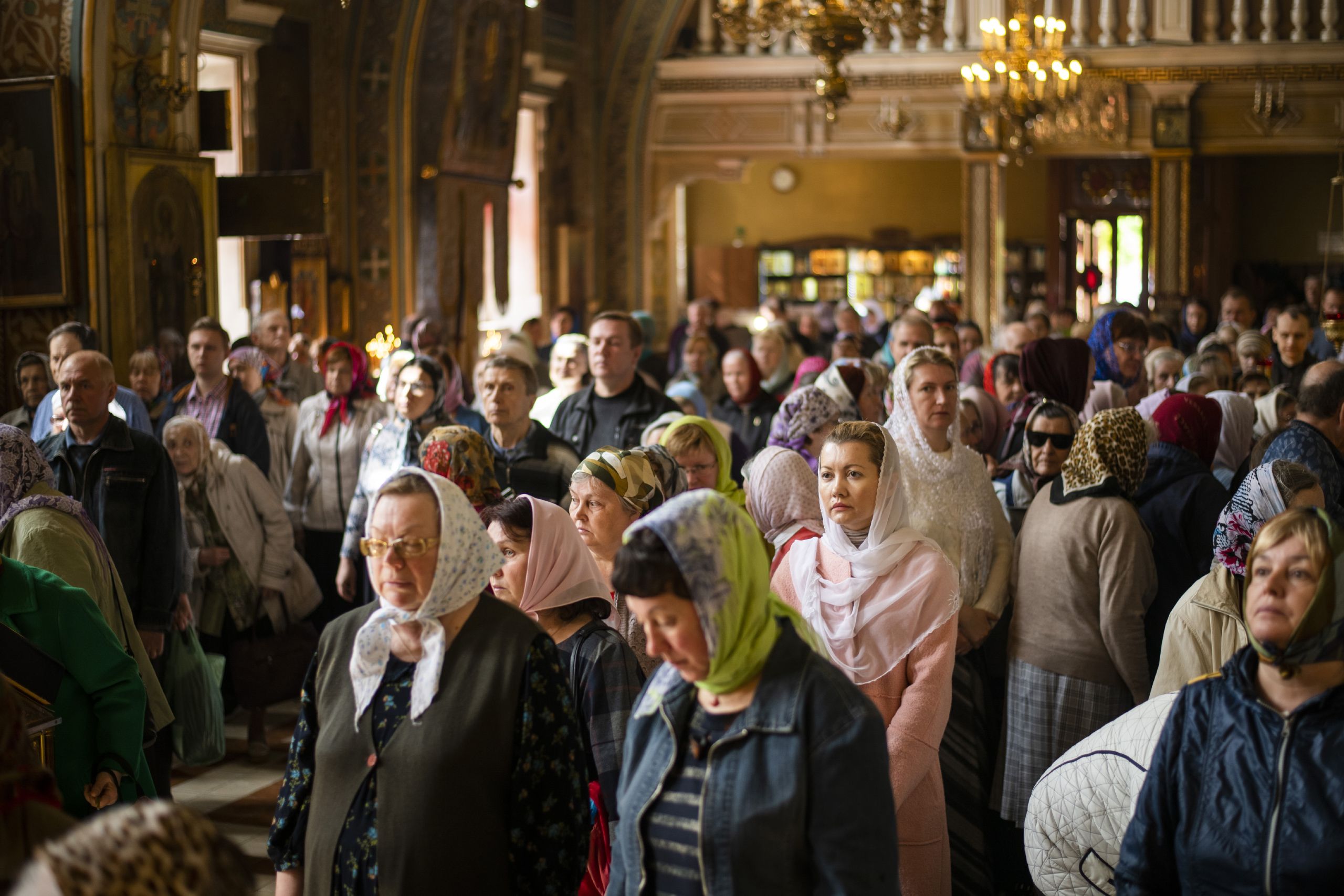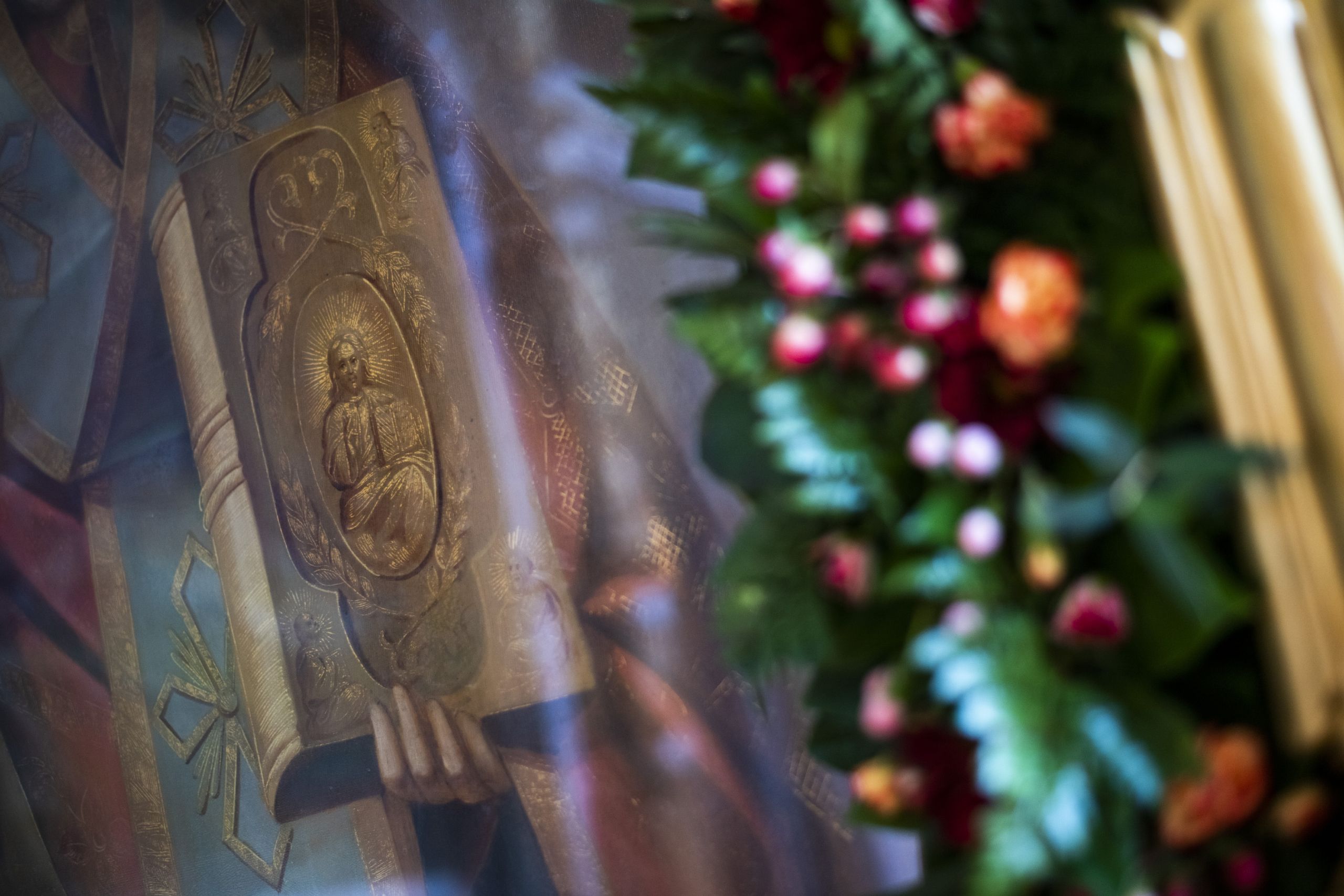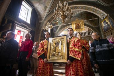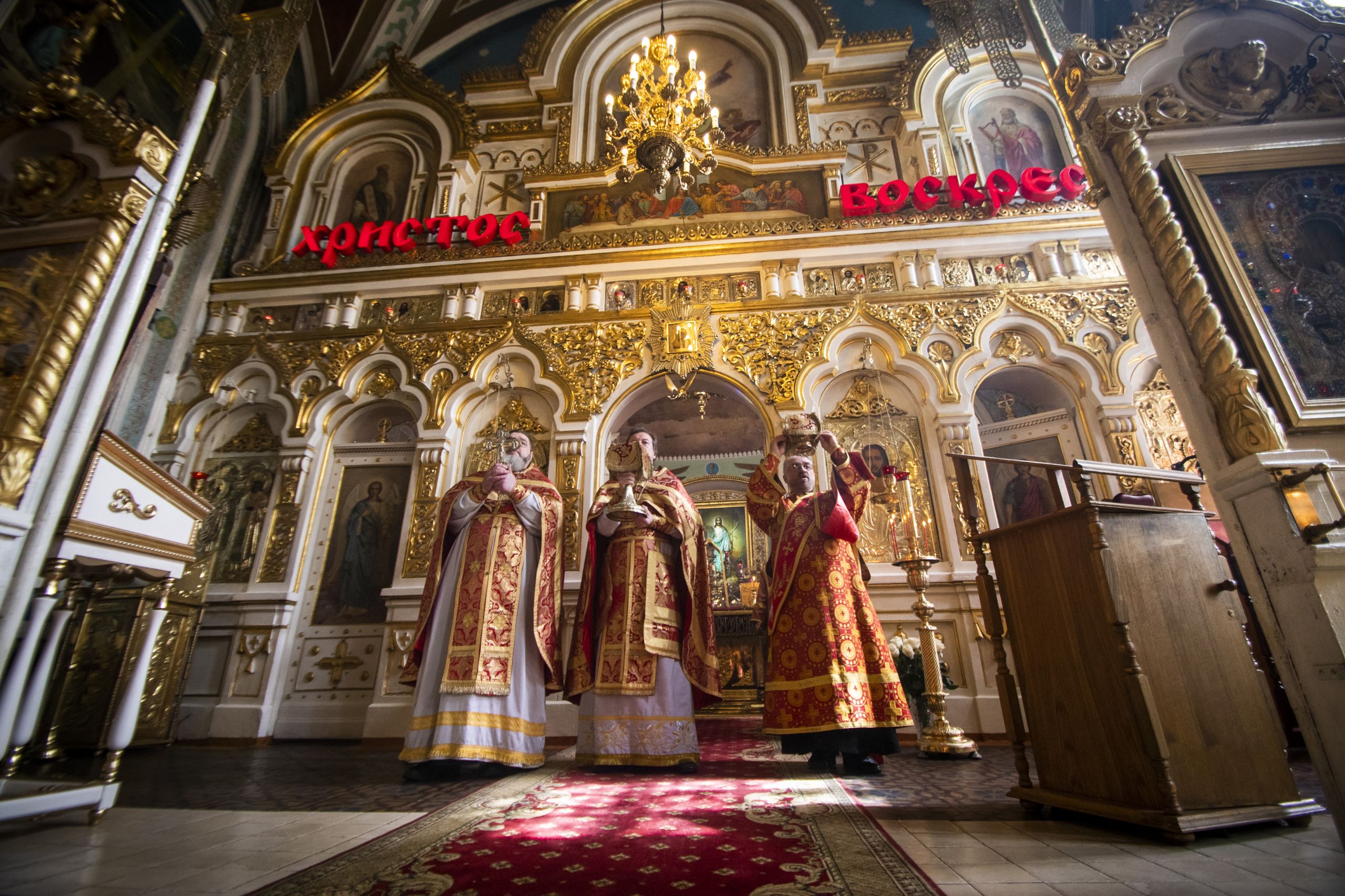 По окончании Литургии верующие прошли крестным ходом вокруг храма. У алтарной части собора священнослужители совершили малое освящение воды.