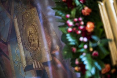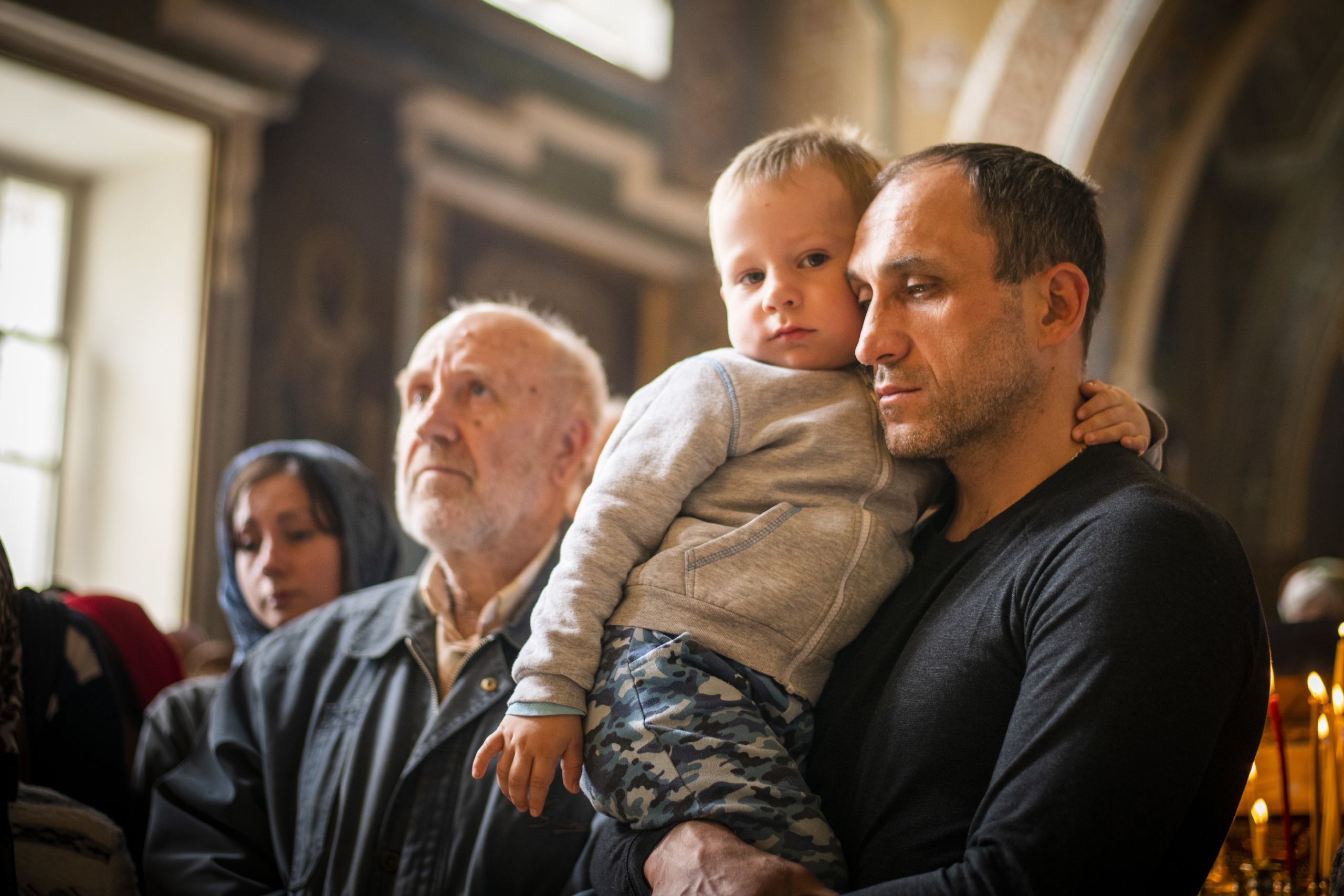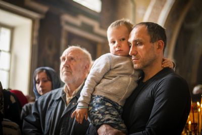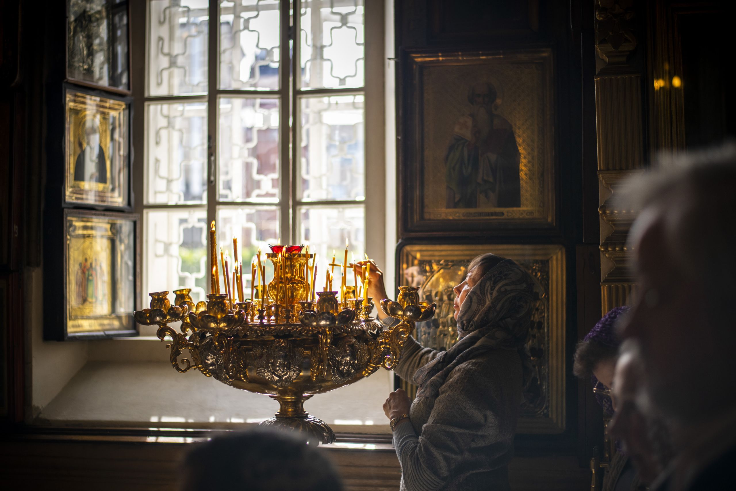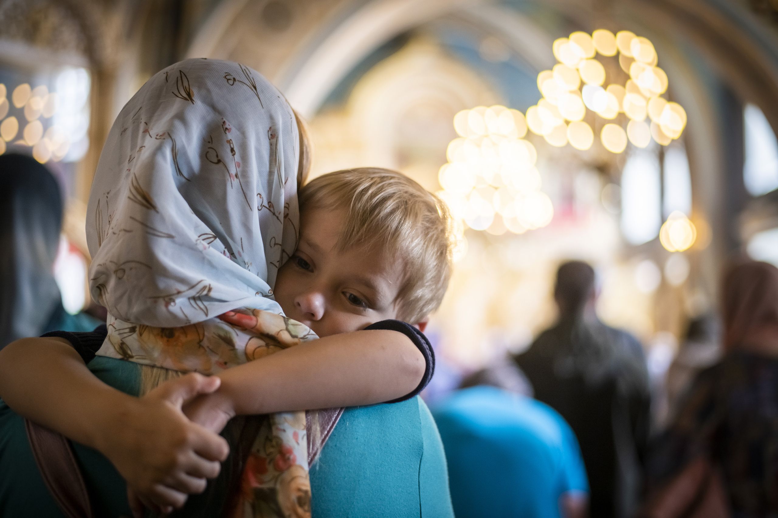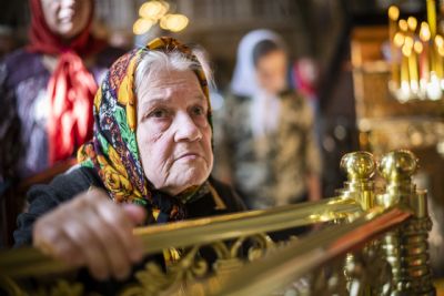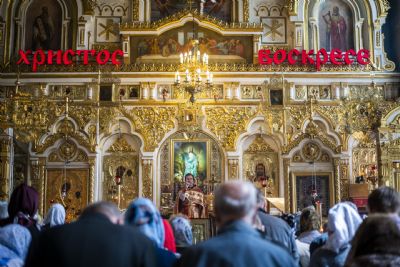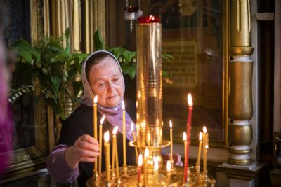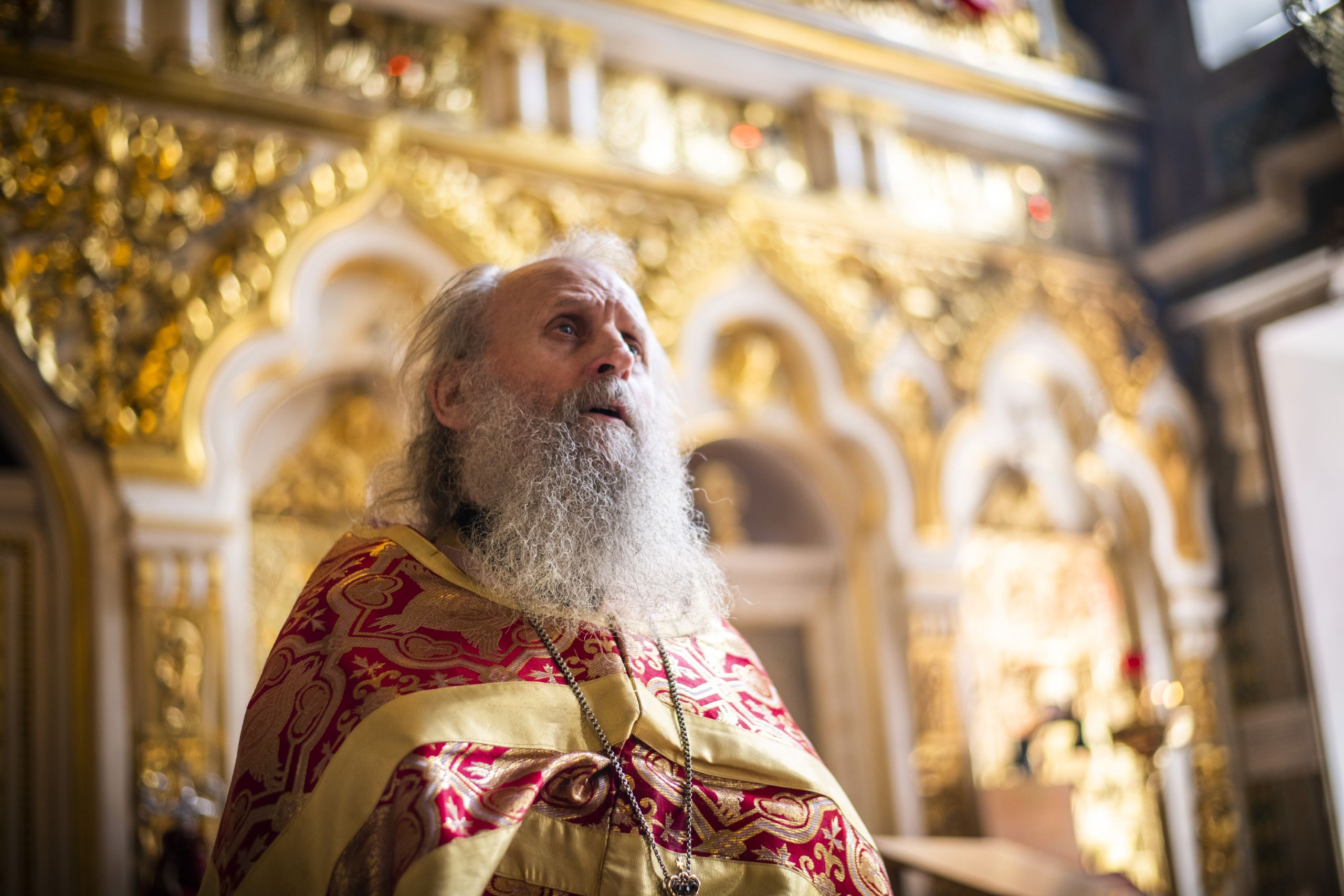 По окончании Литургии верующие прошли крестным ходом вокруг храма. У алтарной части собора священнослужители совершили малое освящение воды.