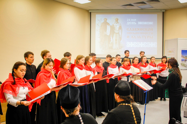 Программа мероприятия продолжилась выступлением смешанного хора семинарии. Студенты духовной школы исполнили греко-латино-славянский тропарь Пасхи и гимн святителя Николая Сербского «Вера вечна».
