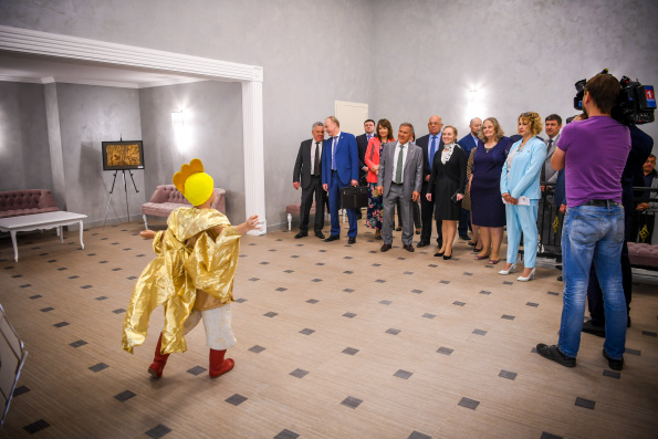 После просмотра интермедии с участием сказовцев Президент осмотрел помещения отремонтированного здания. Глава региона посетил буфет, где были представлены русские традиционные блюда, музейно-выставочный зал, кабинет отдела русской национальной культуры, концертный зал, рассчитанный на 320 мест, молодежную студию.