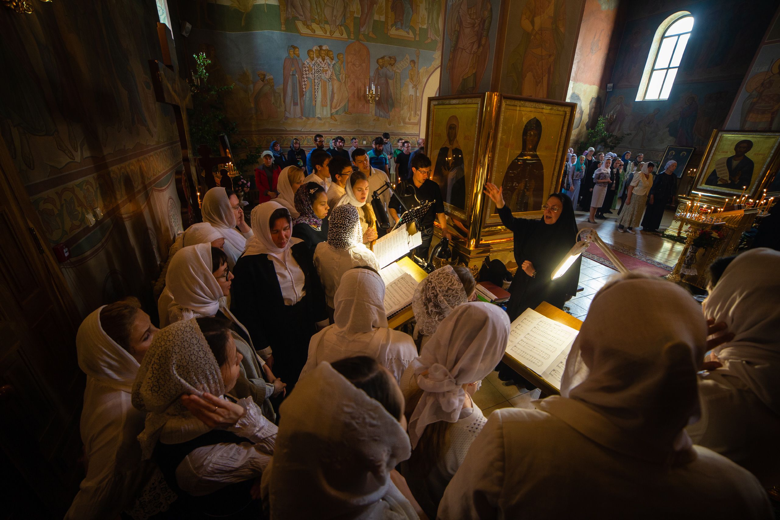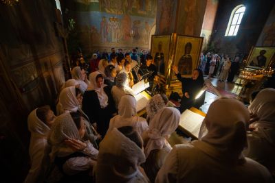 Песнопения исполнил смешанный хор Казанско-Богородицкого мужского монастыря под управлением монахини Амвросии (Кочережкиной).