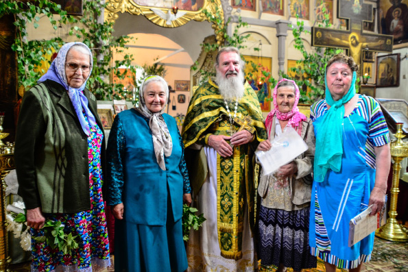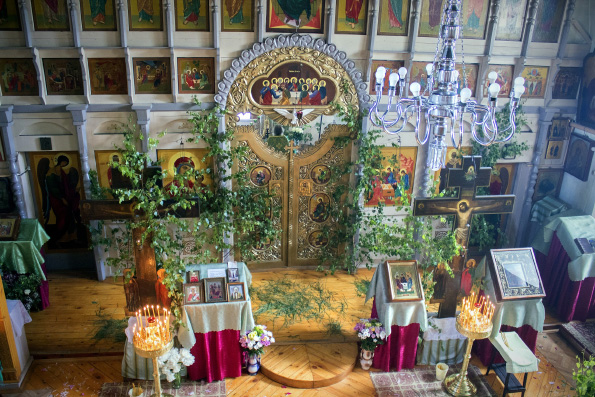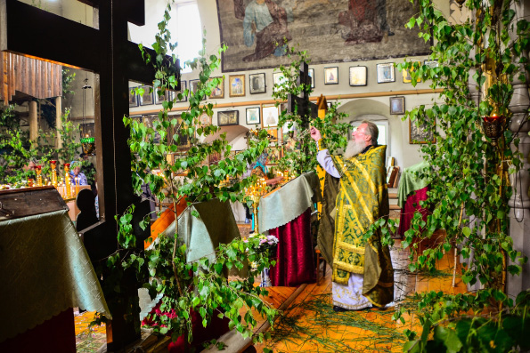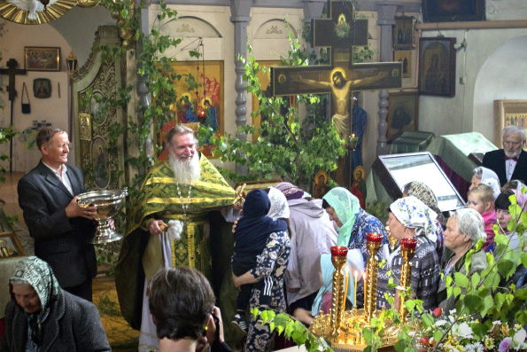 Специально к юбилейной дате в храме был проведен ремонт и закуплена новая утварь. Прихожане украсили храм к двунадесятому празднику березами и цветами.