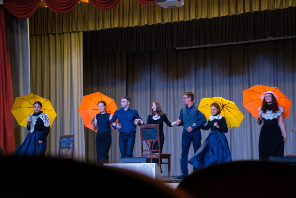 После знакомства с центром воспитанники духовной школы были приглашены в концертный зал на вечерний спектакль «Жалобная книга», поставленный по рассказам А.П. Чехова. Впервые на сцену Культурного центра вышли артисты старшего состава театральной студии «Сказ», действующей при казанском храме преподобного Серафима Саровского под руководством режиссёра Марины Мусиенко.