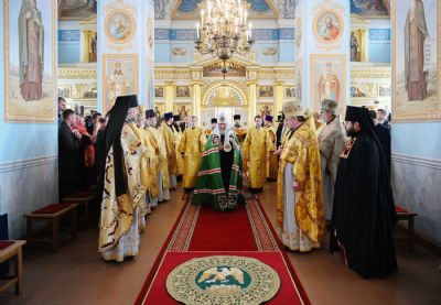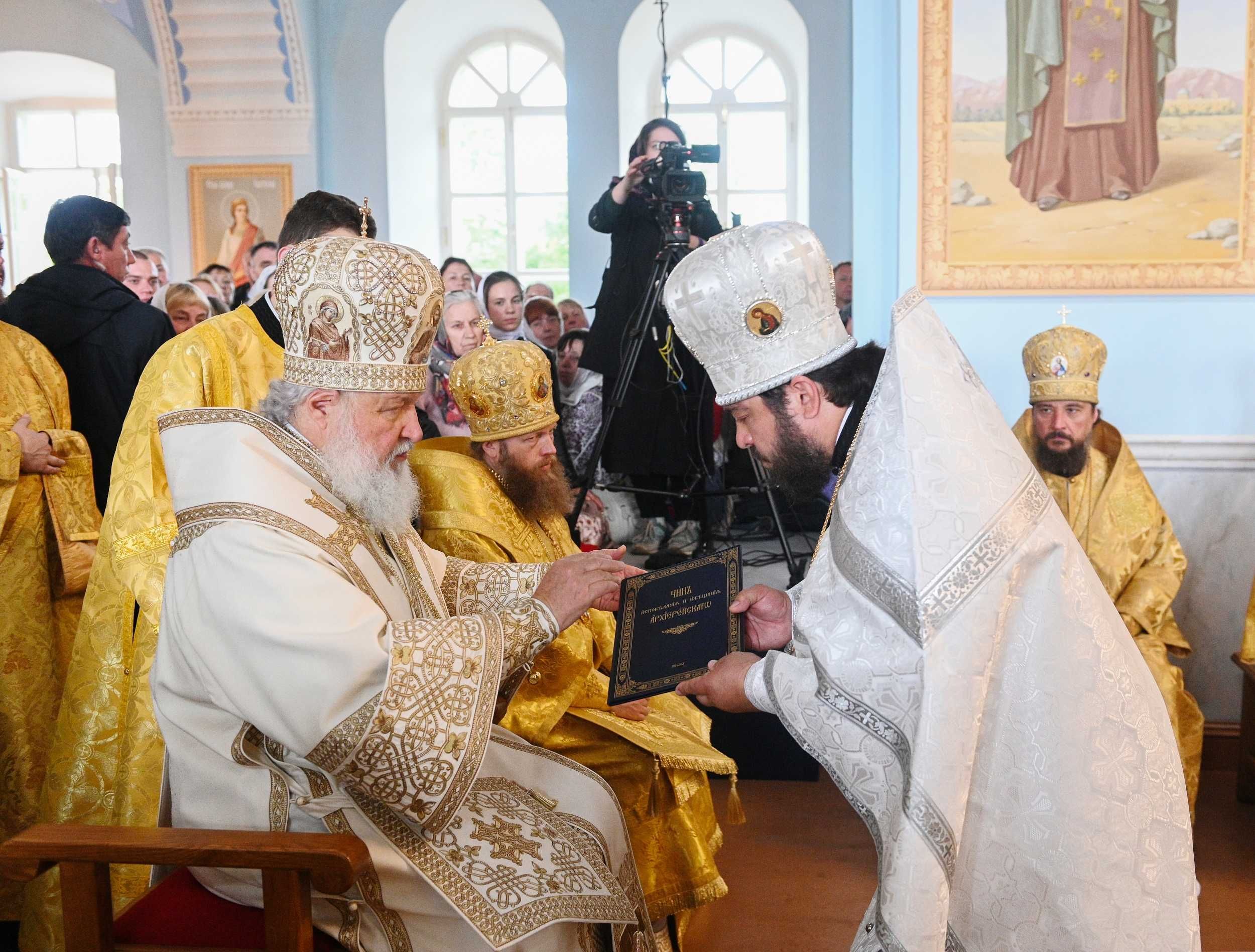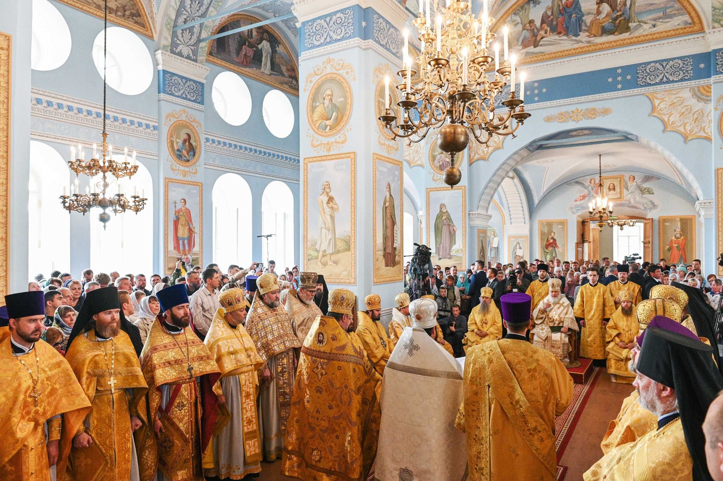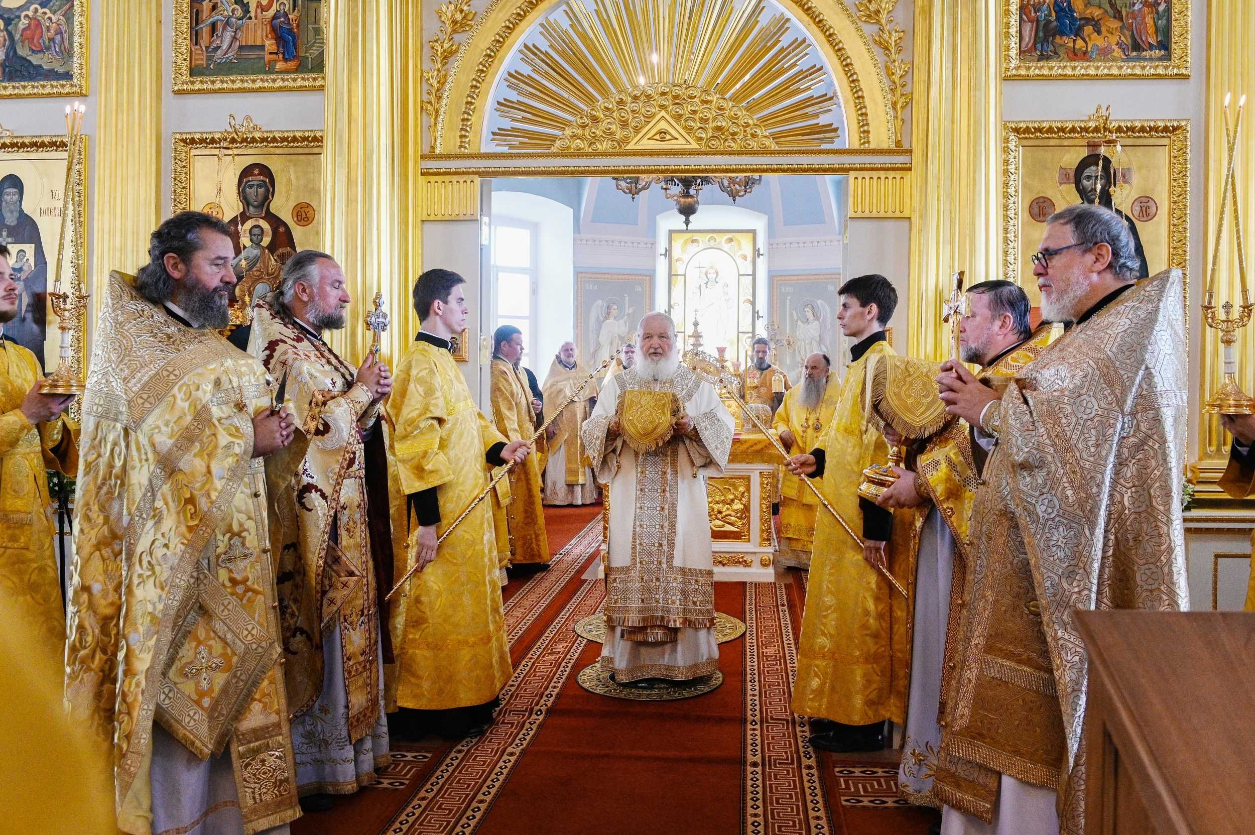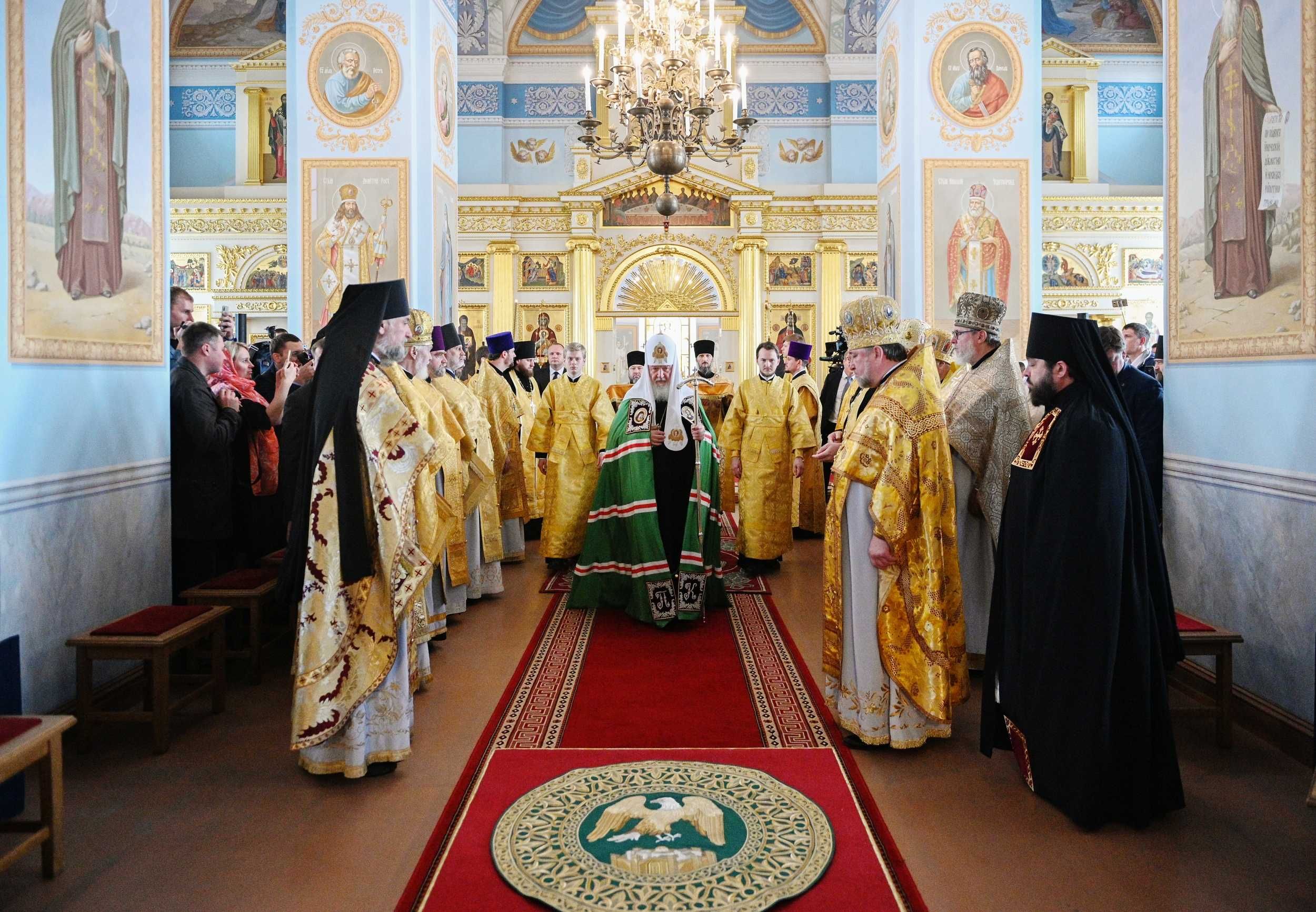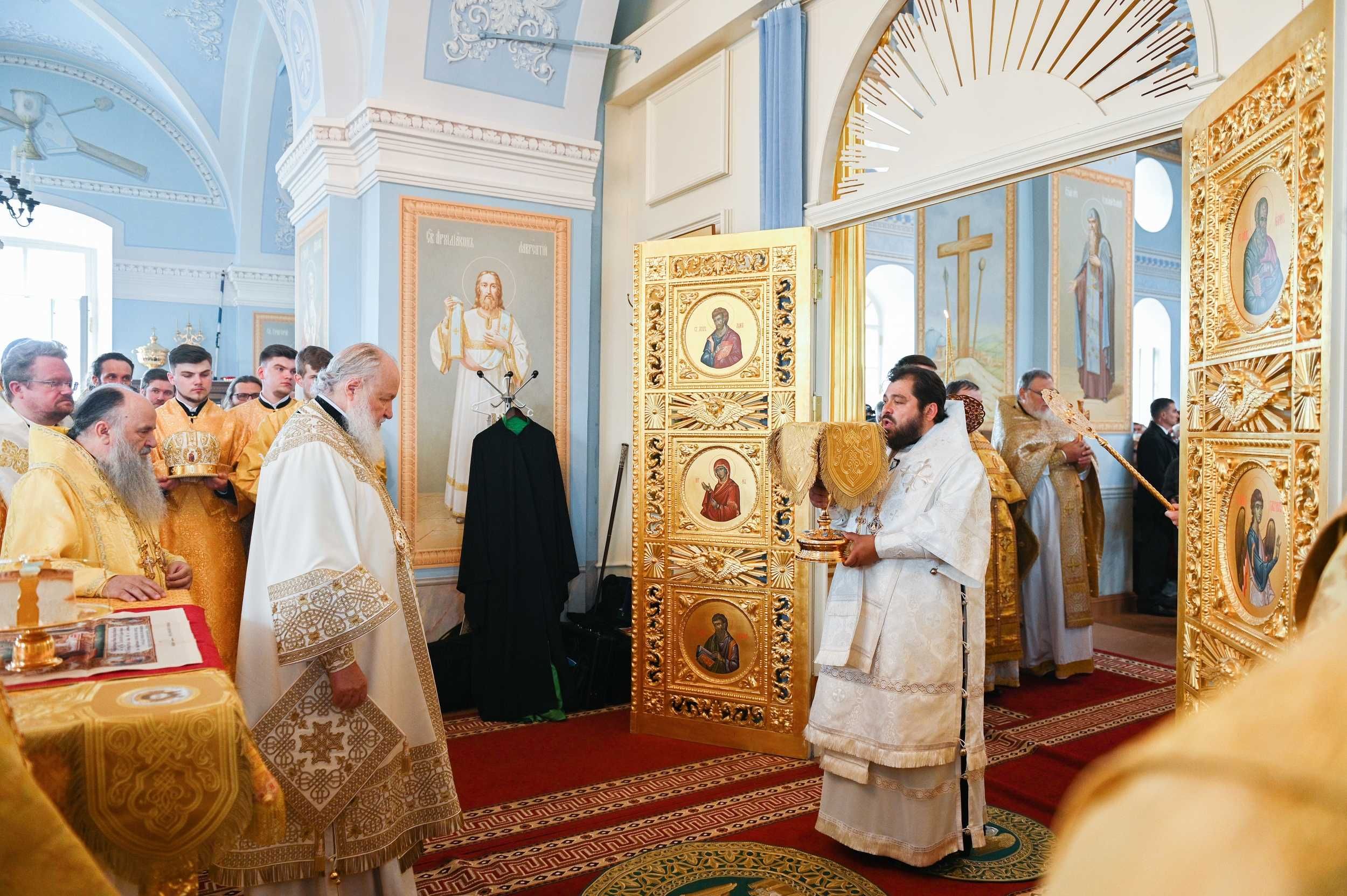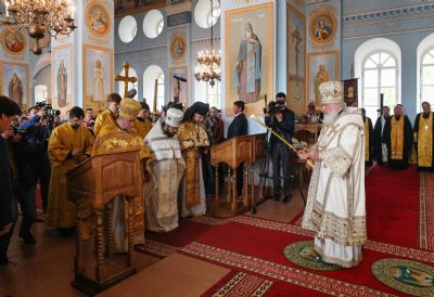 Затем Предстоятель Русской Православной Церкви совершил чин великого освящения верхнего храма собора Рождества Пресвятой Богородицы и Божественную литургию в новоосвященном храме.